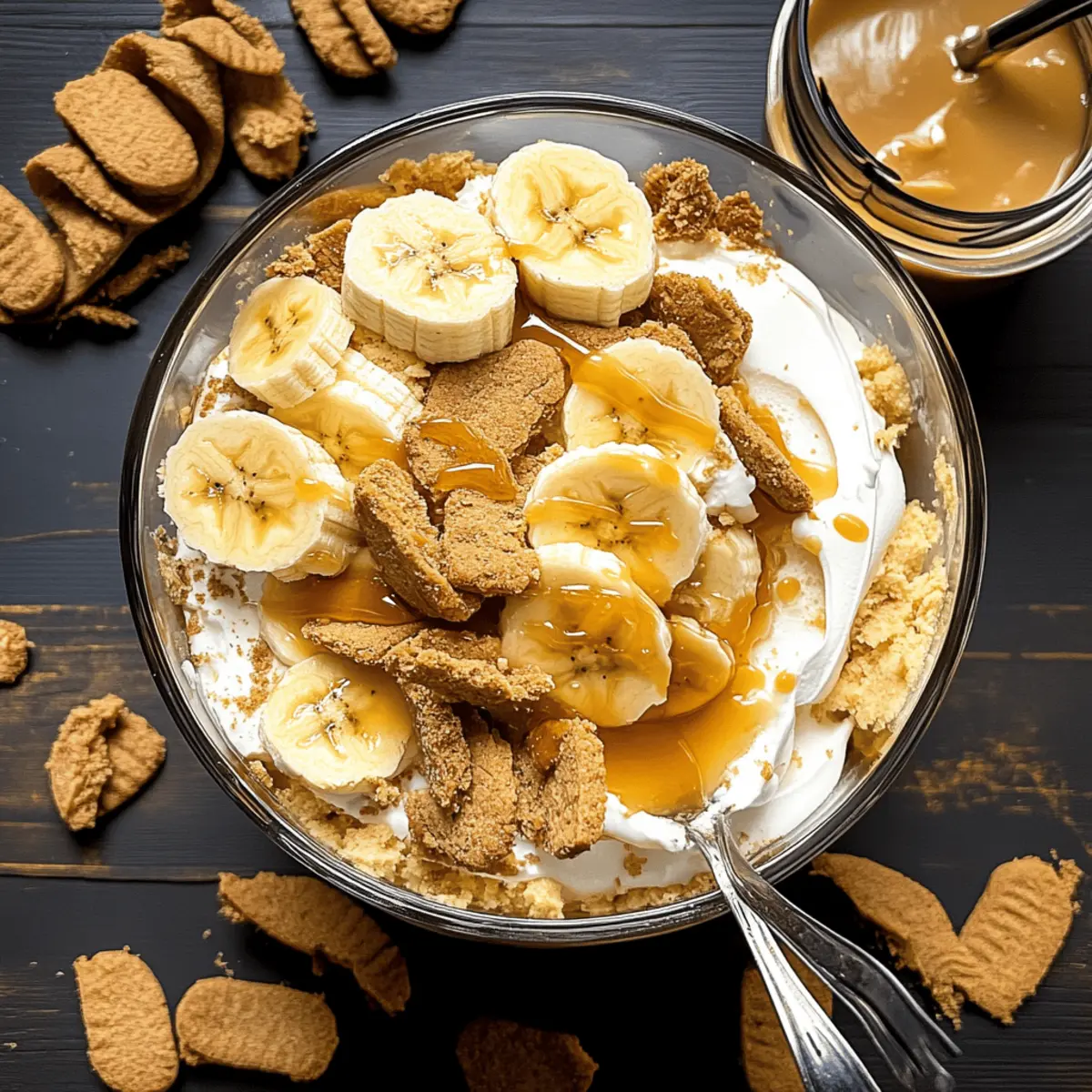 Irresistible Layers: This dessert features layer upon layer of rich vanilla pudding, fresh bananas, and crunchy Biscoff cookies that promise a delightful bite every time.