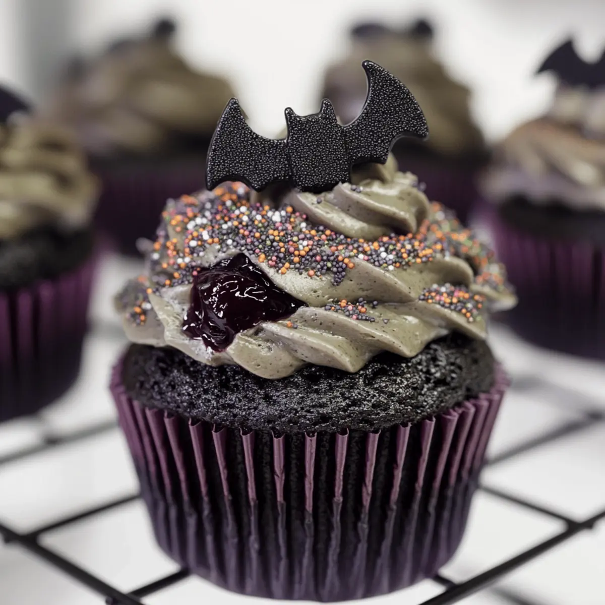 Once the cupcakes are cool, pipe the buttercream frosting onto each cupcake, creating delightful swirls. Add colorful sprinkles and a gummy bat on top for a festive touch. For the cherry surprise, use a small piping bag to inject a teaspoon of cherry preserve into the center of each cupcake, providing a delightful burst of flavor with every bite.