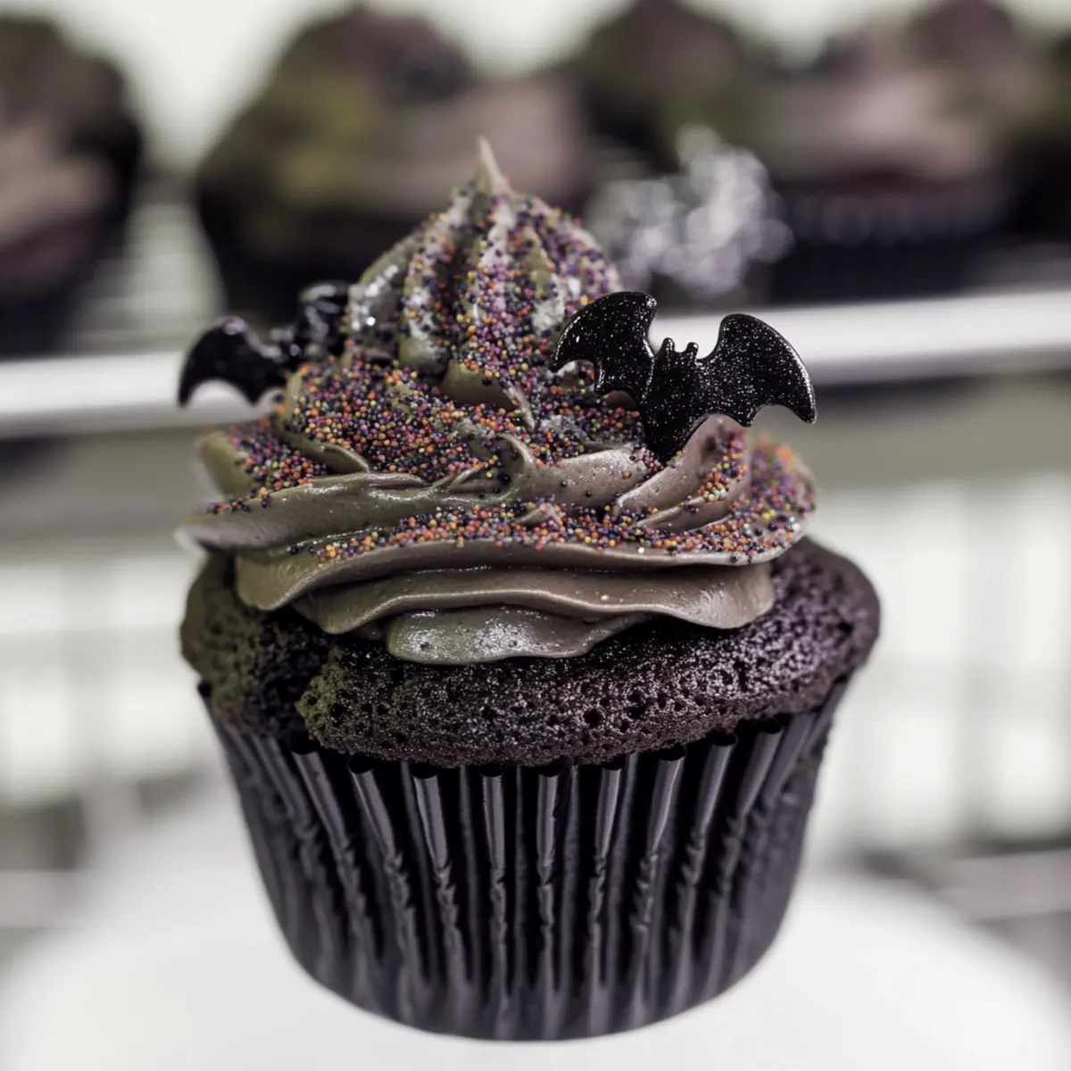 - Pipe the buttercream frosting onto each cupcake, adding sprinkles and a gummy bat for decoration.