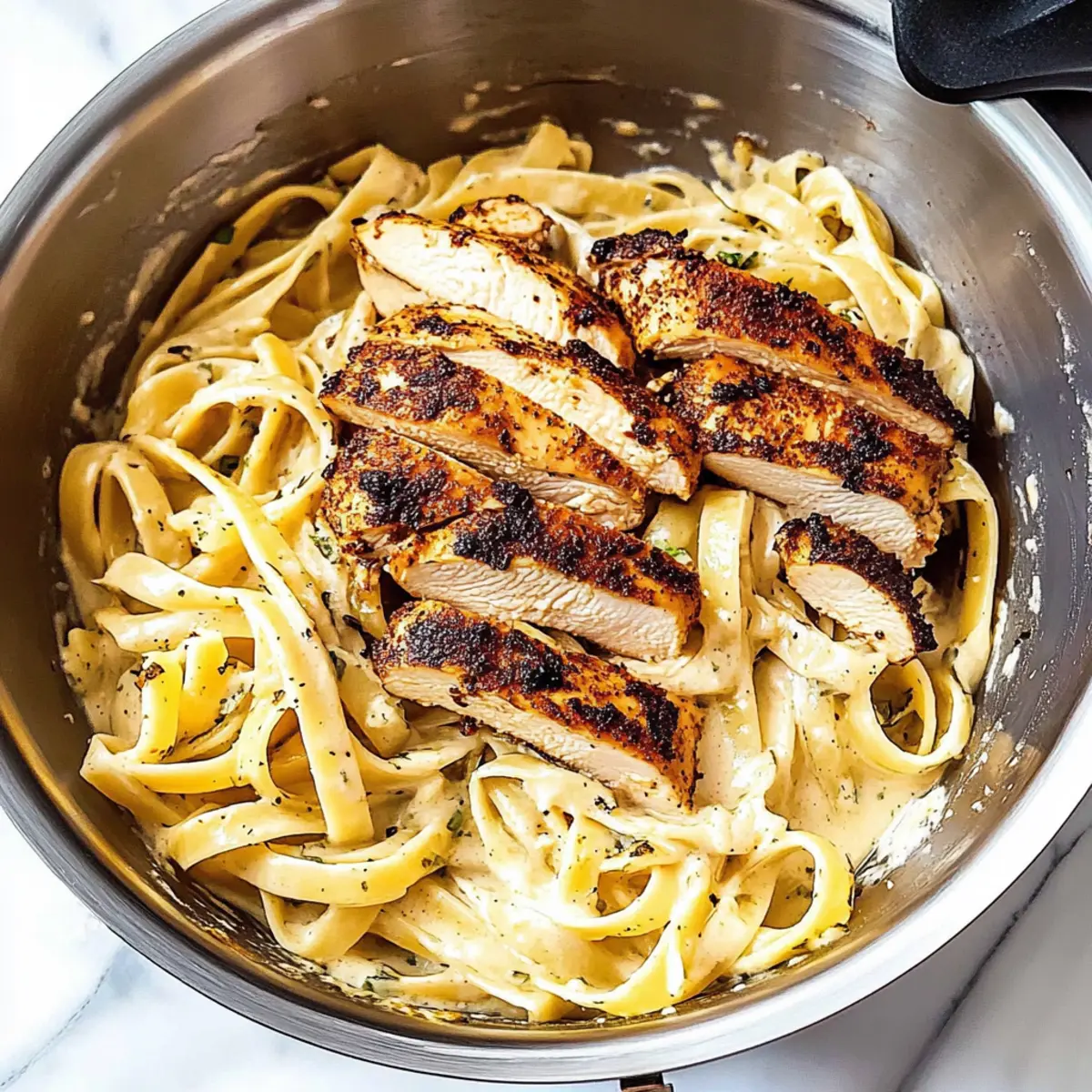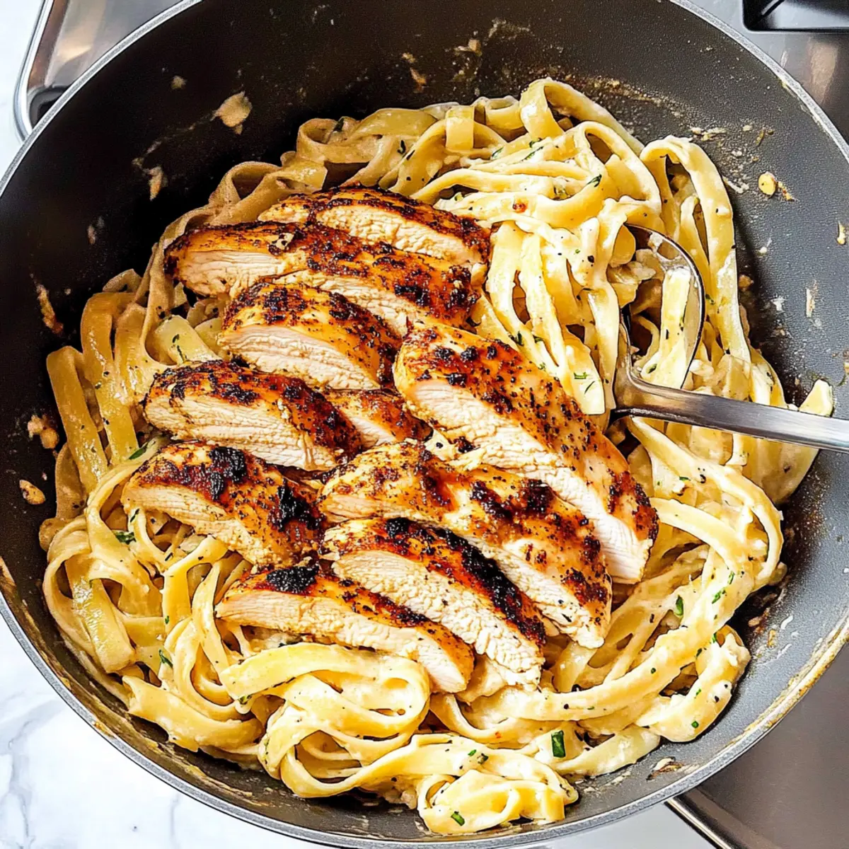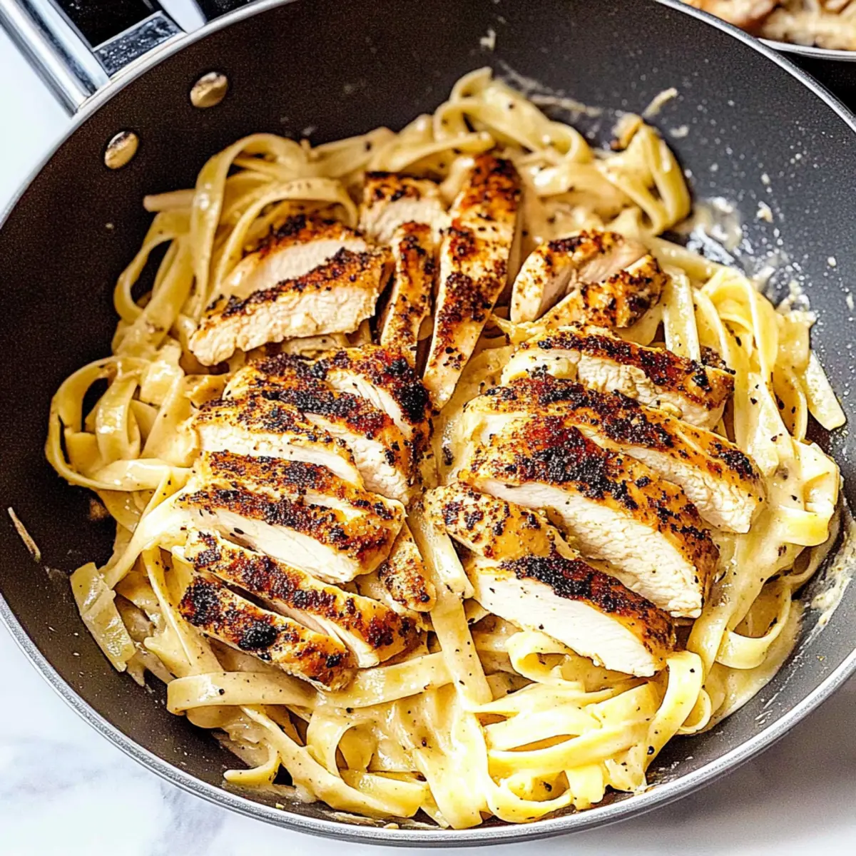 - Add the fettuccine to the skillet, toss to coat. Slice the rested chicken and layer on top. Season if desired.