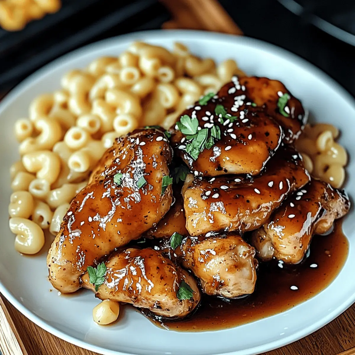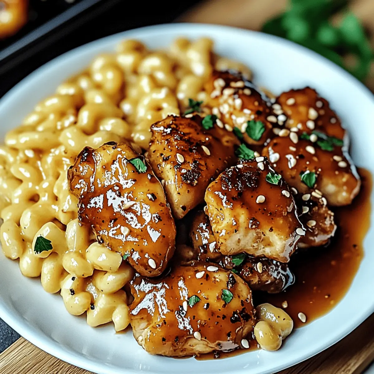 Fold the cooked macaroni into the cheesy mixture until all pasta is well coated and combined. Arrange the glazed honey pepper chicken alongside or atop the creamy mac and cheese on a serving platter. Ladle any extra glaze over the chicken for a delightful presentation, ready to bring warmth and comfort to your dinner table.
