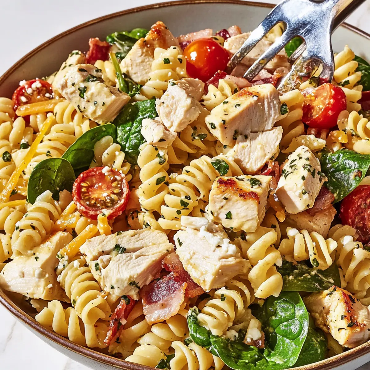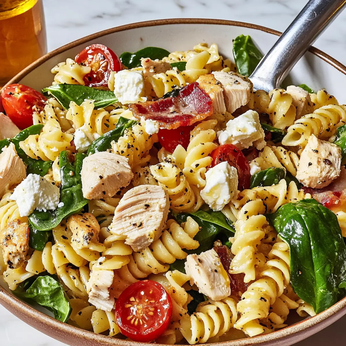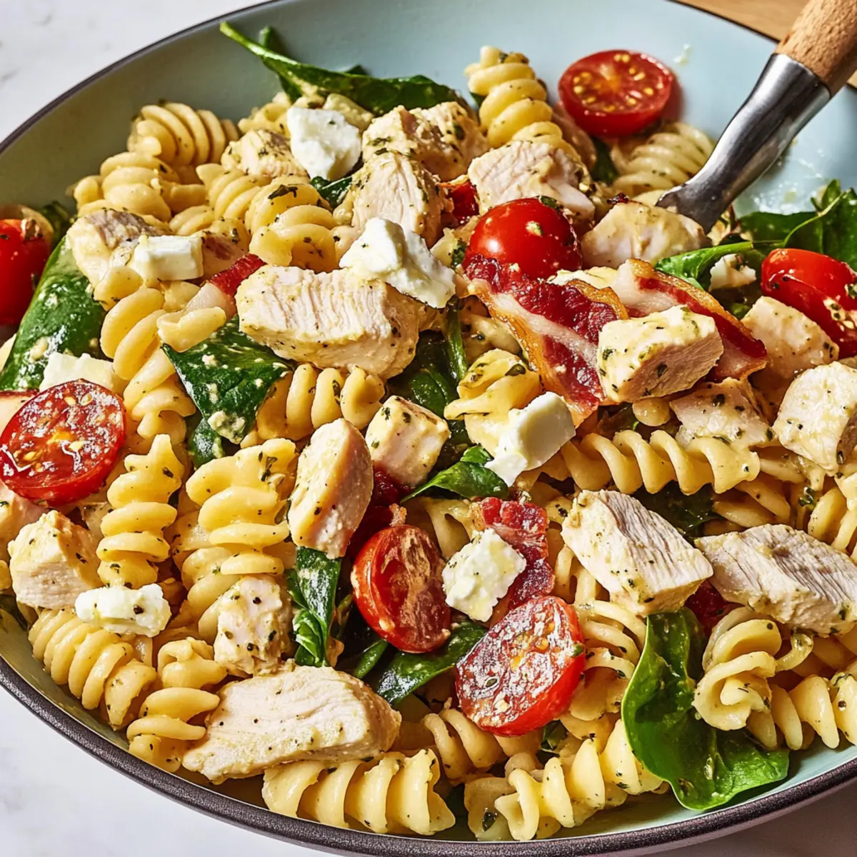 - In a large mixing bowl, combine the cooled fusilli pasta, chopped chicken, crispy bacon, halved grape tomatoes, fresh spinach, crumbled feta, diced red onion, and freshly chopped dill. Gently stir the ingredients together until well-mixed.