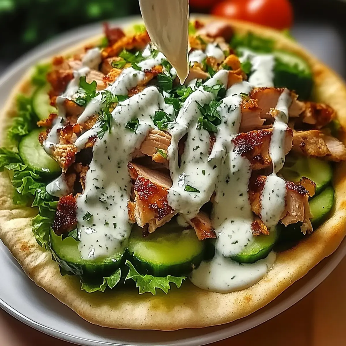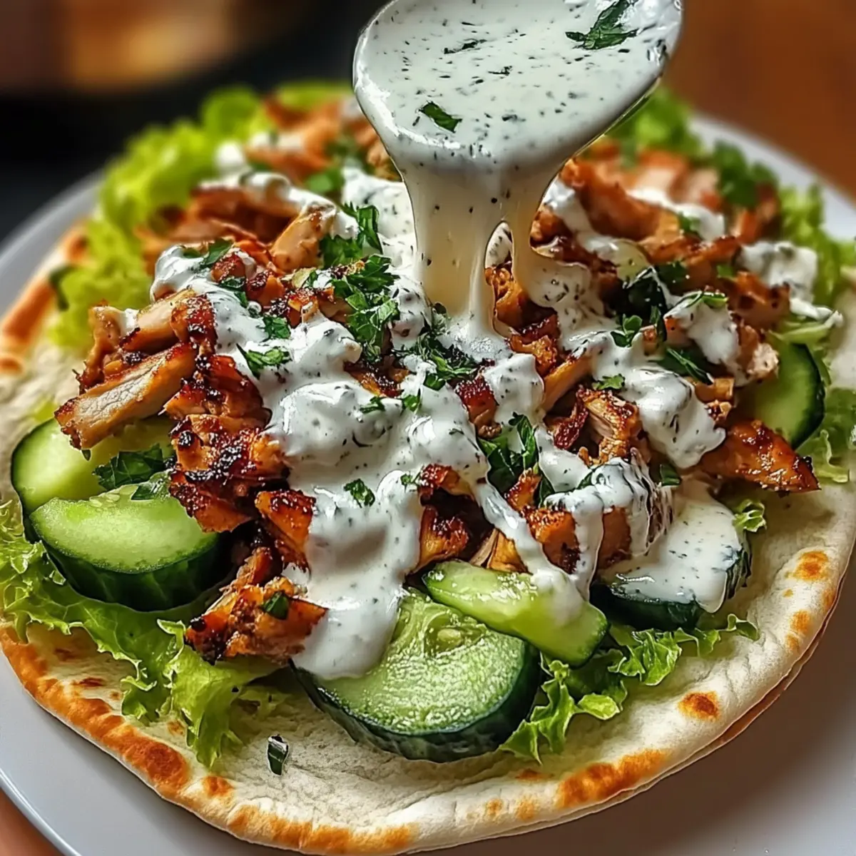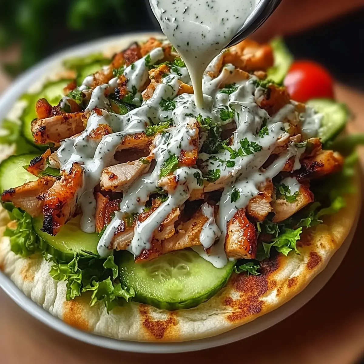 - Lay out your pita bread or wraps, add sliced chicken, fresh vegetables, and drizzle with garlic sauce.