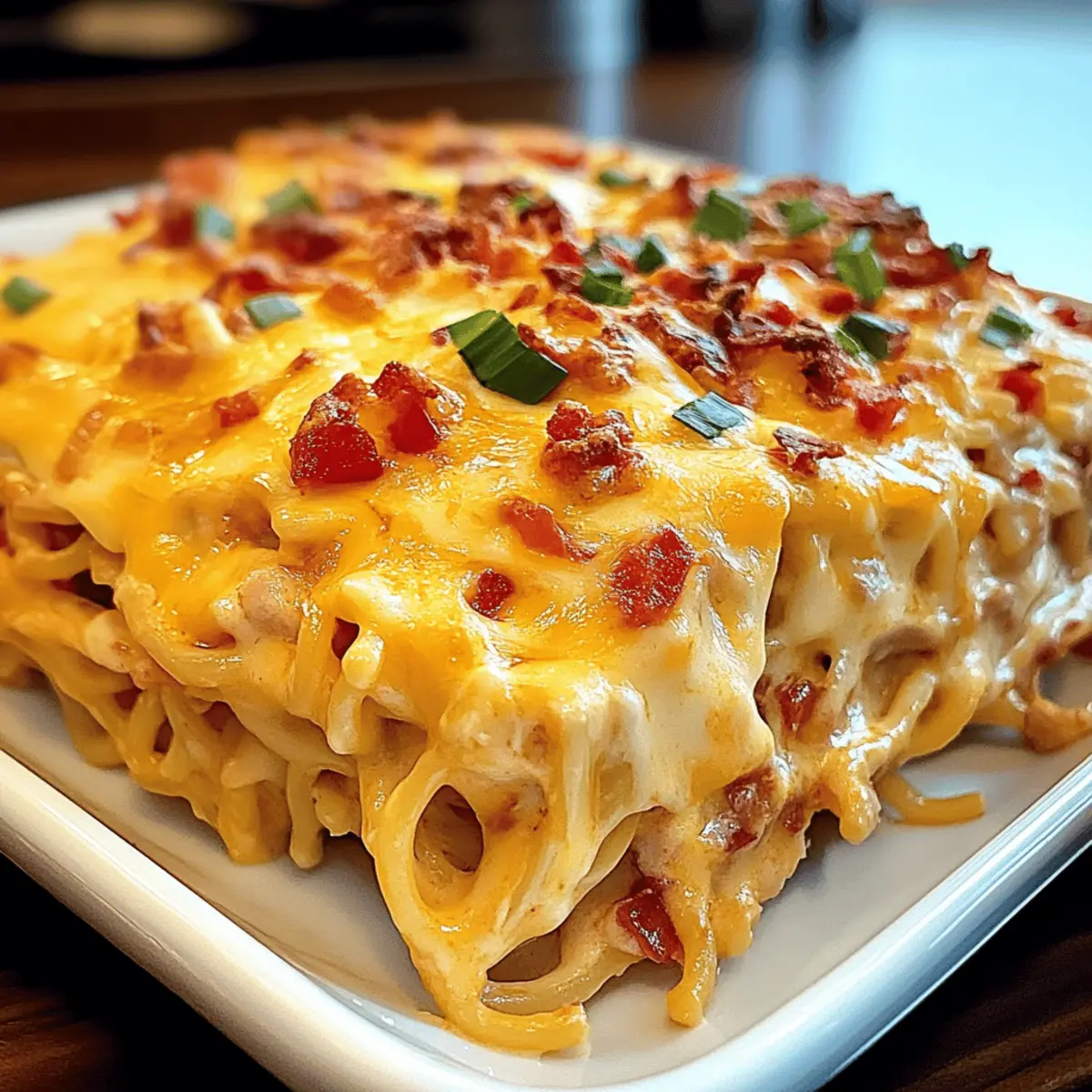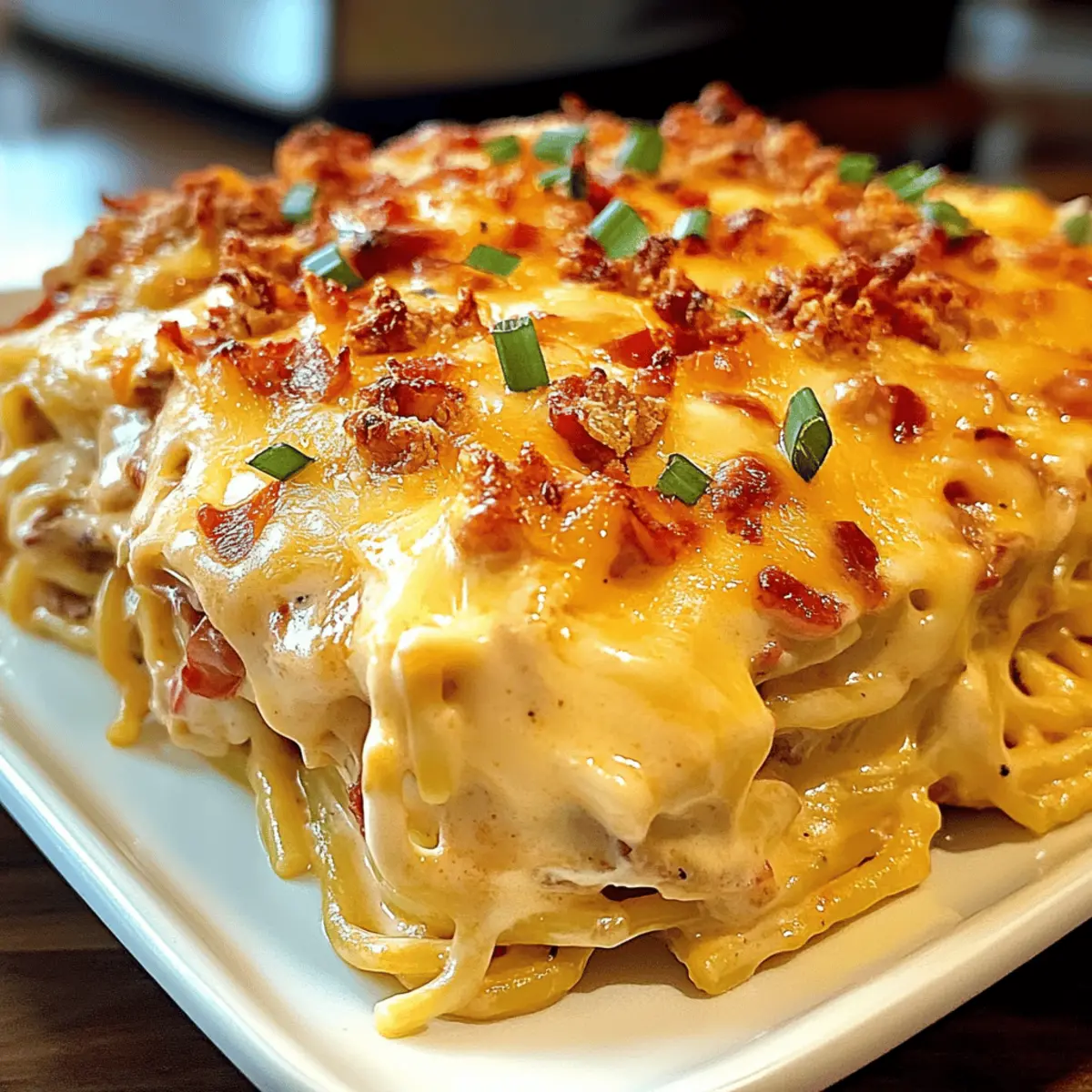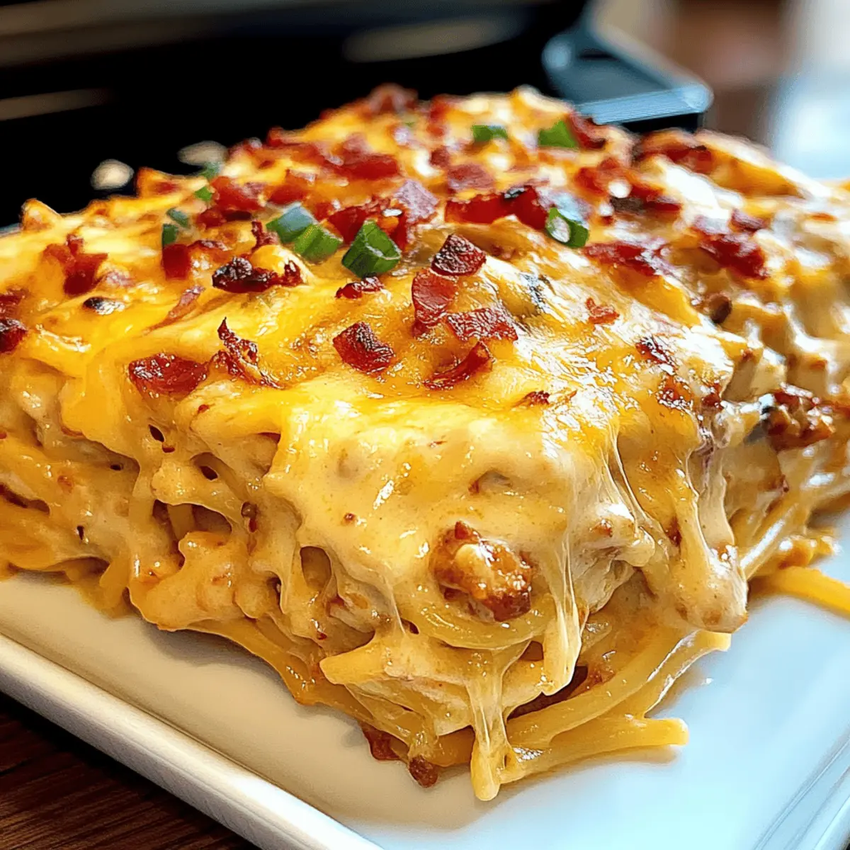 After baking, remove the casserole from the oven and let it cool for about 5 minutes. This resting time helps the flavors settle together. Finally, sprinkle sliced green onions over the top for a pop of color and zesty flavor before serving your delightful Spicy Southern Cheesy Chicken Spaghetti Casserole!