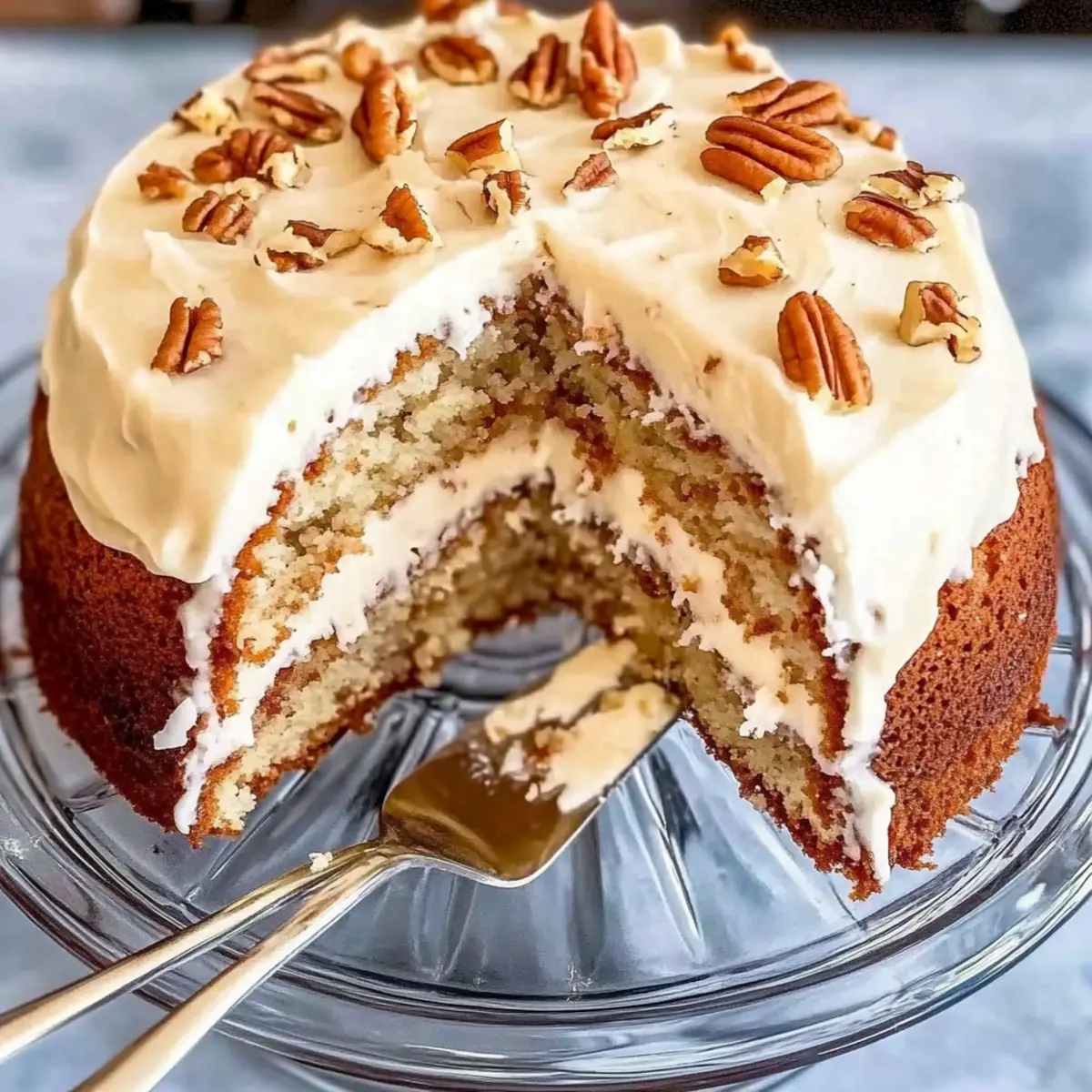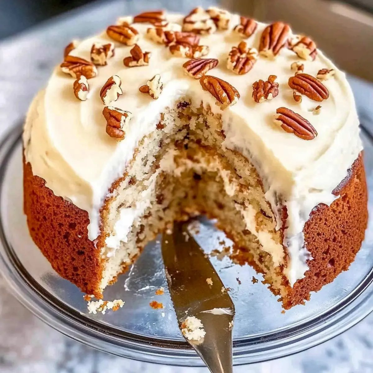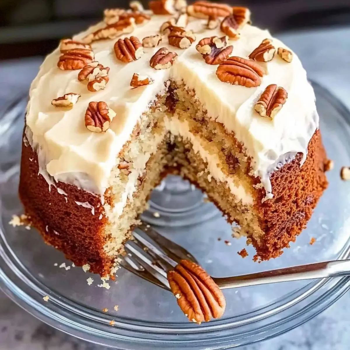 - Spread cream cheese frosting over the cooled cake and sprinkle with toasted pecans if desired.