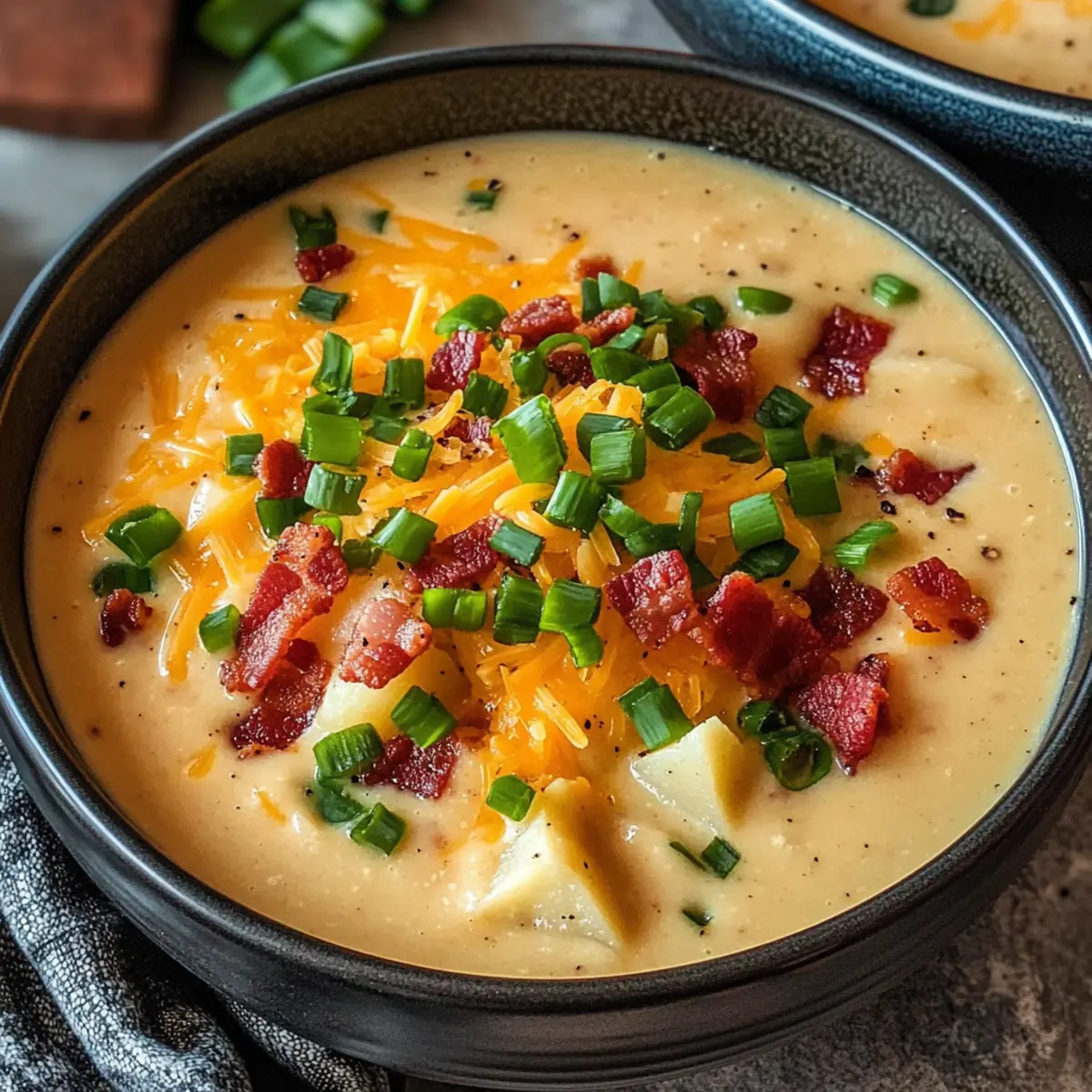 - Ladle into bowls and top with crumbled bacon, extra cheddar cheese, and chopped green onions.
