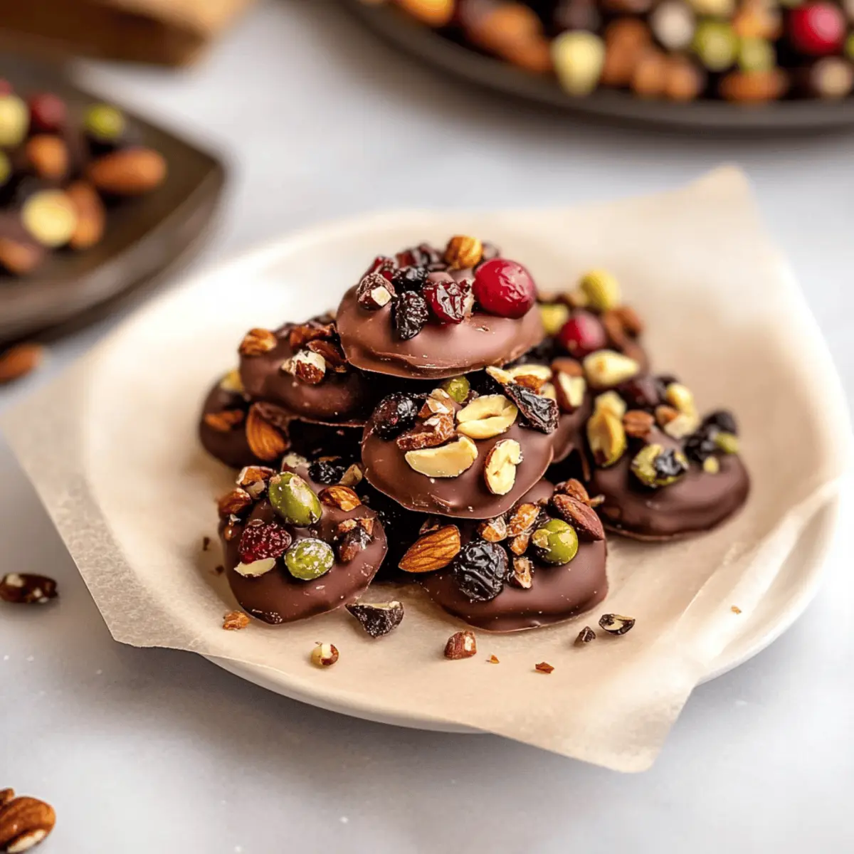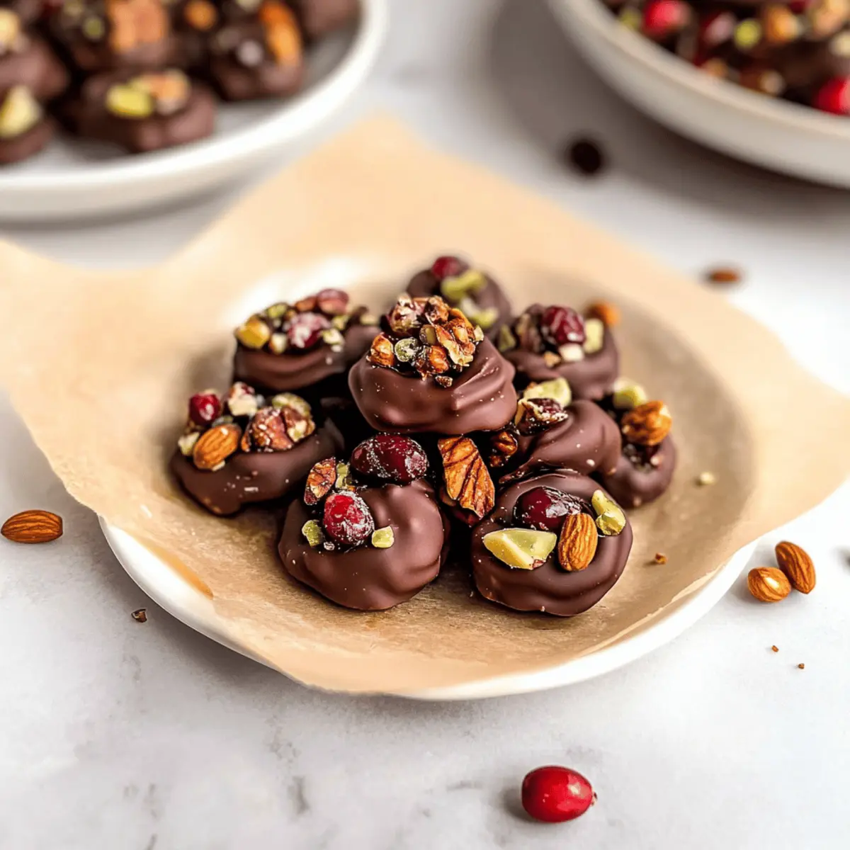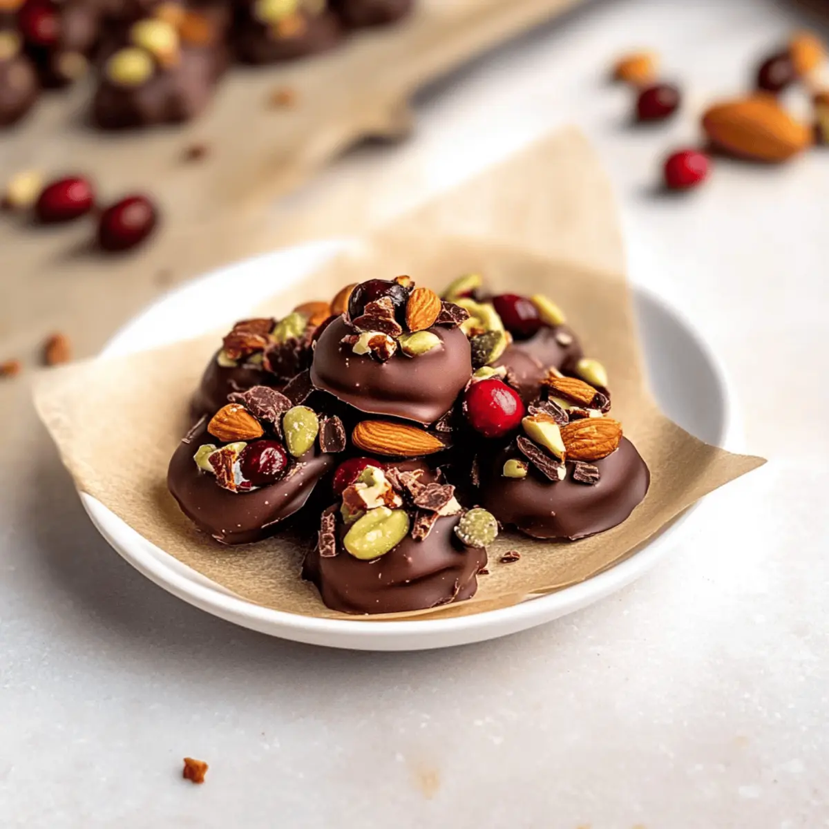 These delightful Cranberry Nut Clusters are perfect for meal prep enthusiasts looking to save time during busy weeks! You can prepare the chocolate base up to 24 hours in advance by melting the chocolate and dropping the circles onto the parchment, then refrigerating them until set. The toppings can also be prepped ahead—measure and mix your favorite nuts and dried fruits, and store them in an airtight container for easy access. When you’re ready to serve, simply sprinkle the toppings on the chilled chocolate bases and allow the clusters to sit at room temperature for a few minutes to soften slightly. This way, your clusters will be just as delicious and perfectly crunchy, ready to enjoy in no time!