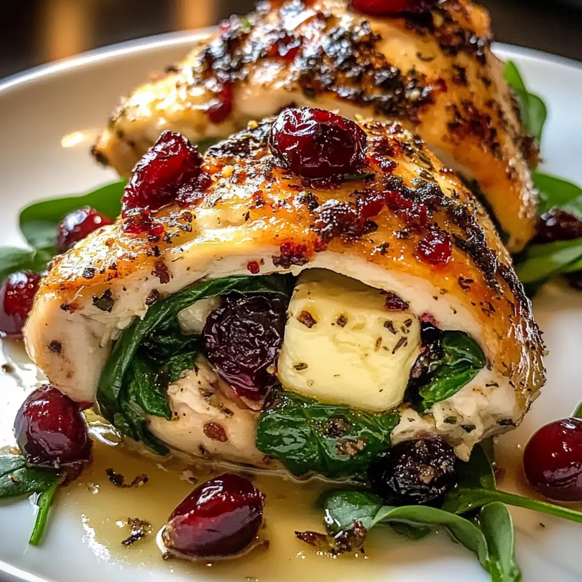 - Stuff the chicken breasts with the spinach-cranberry mixture and Brie.