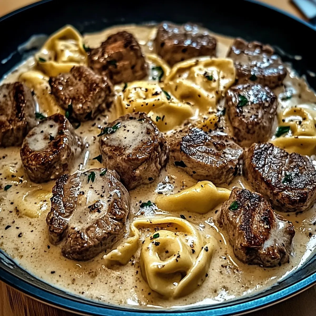 6. Return the steak (cut into bite-sized pieces) and tortellini to the skillet. Toss to coat everything in the creamy sauce for 2 minutes.