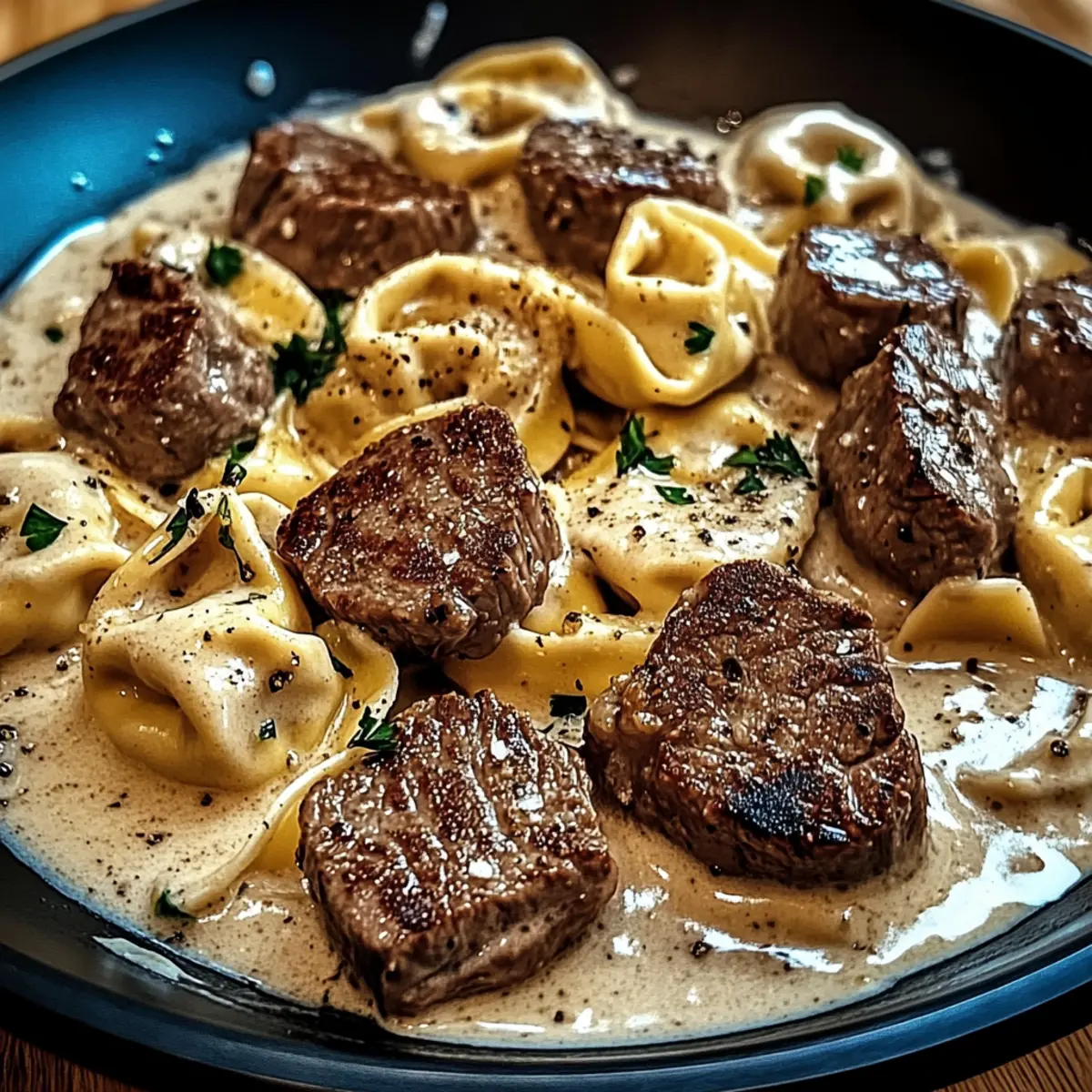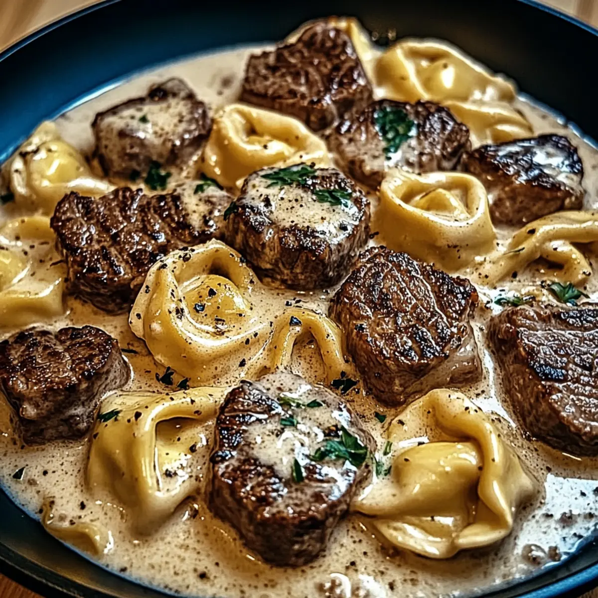 Rich, Creamy Flavor: The garlic cream sauce envelops tender steak and cheesy tortellini, making every bite a luxurious experience.