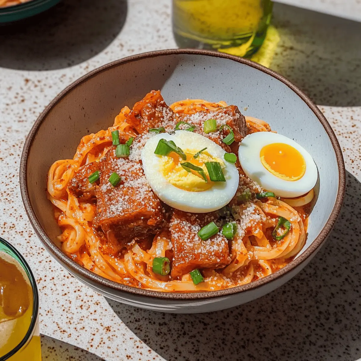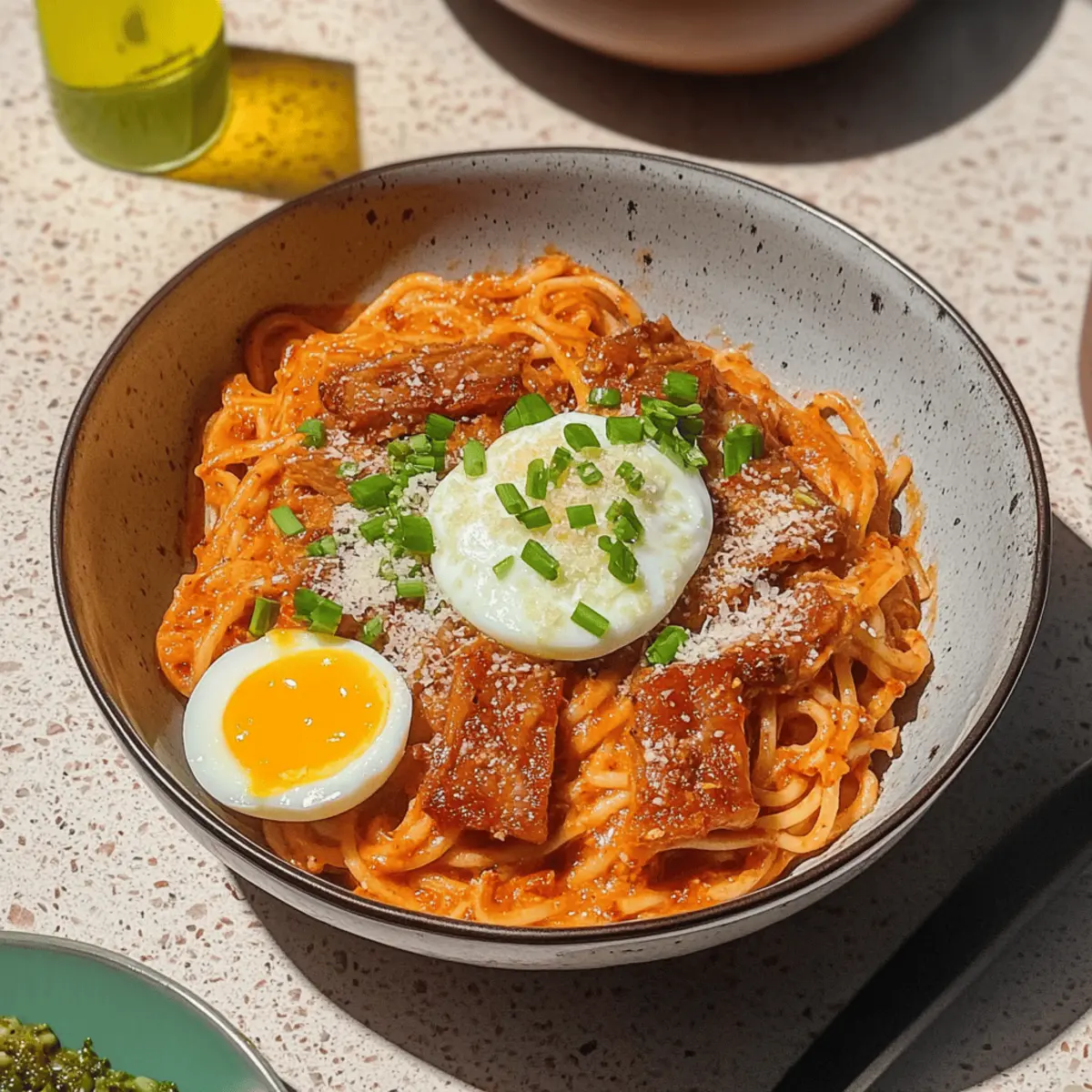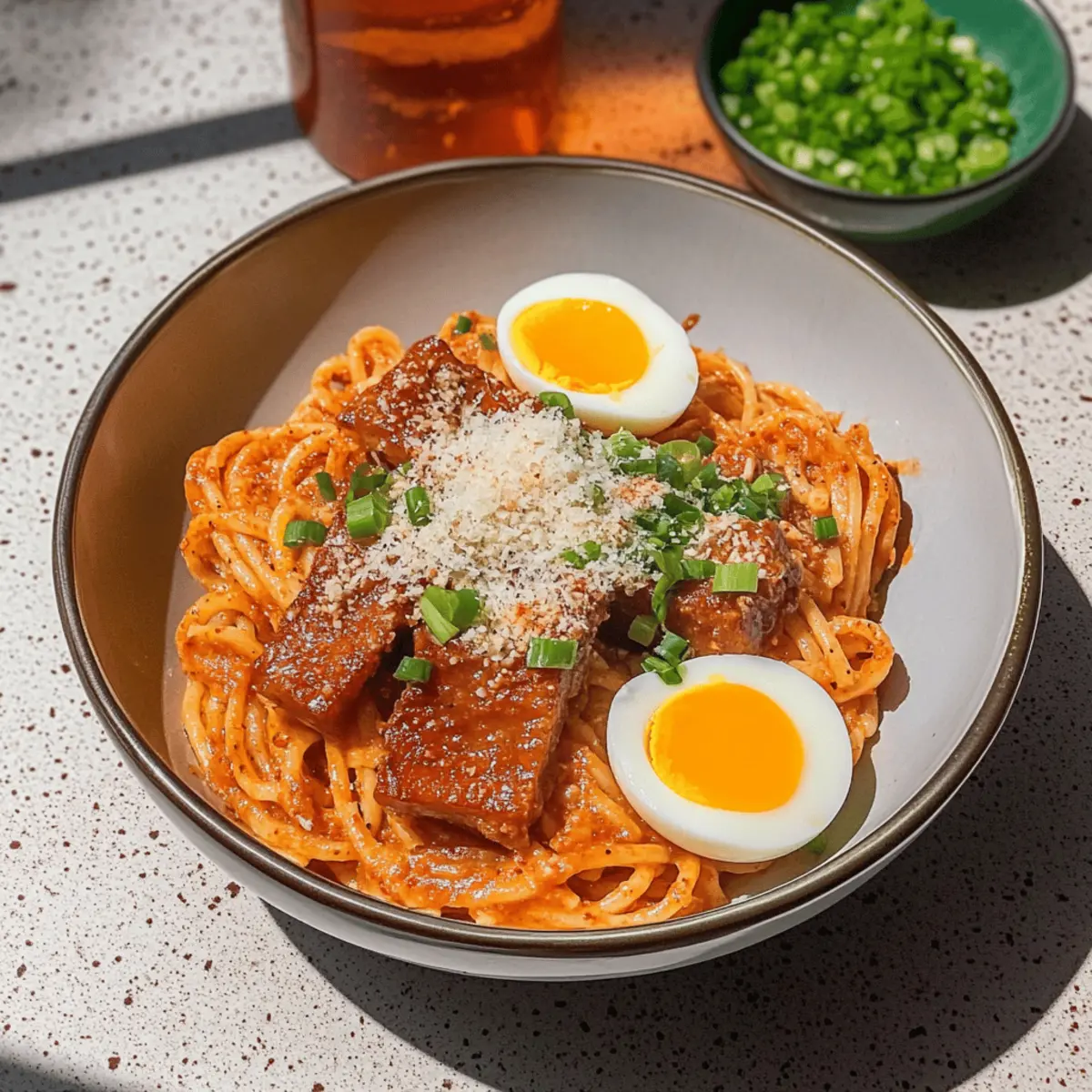 Finally, transfer the creamy pasta to serving plates, topping each with a soft-boiled egg cut in half and a generous sprinkle of sliced green onions. The final presentation should be colorful and inviting, capturing the essence of this comforting dish. Serve immediately and enjoy your delicious homemade Creamy Korean Ssamjang Pasta!