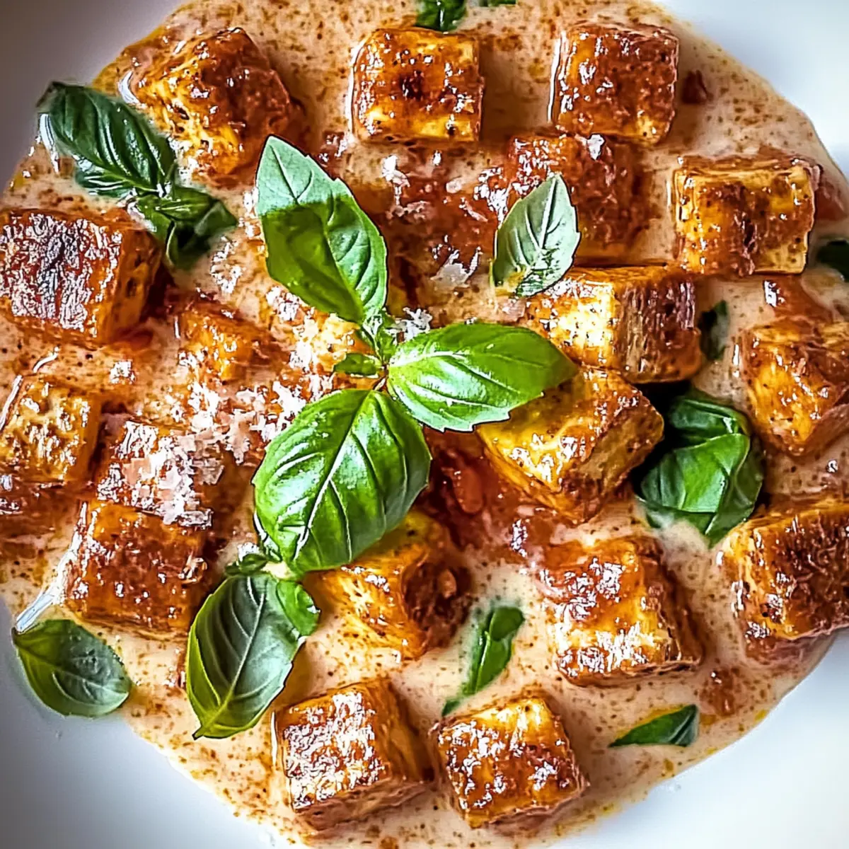 Deliciously Creamy: The savory garlic tomato sauce coats the crispy tofu, ensuring every bite is an explosion of flavor that warms the heart.