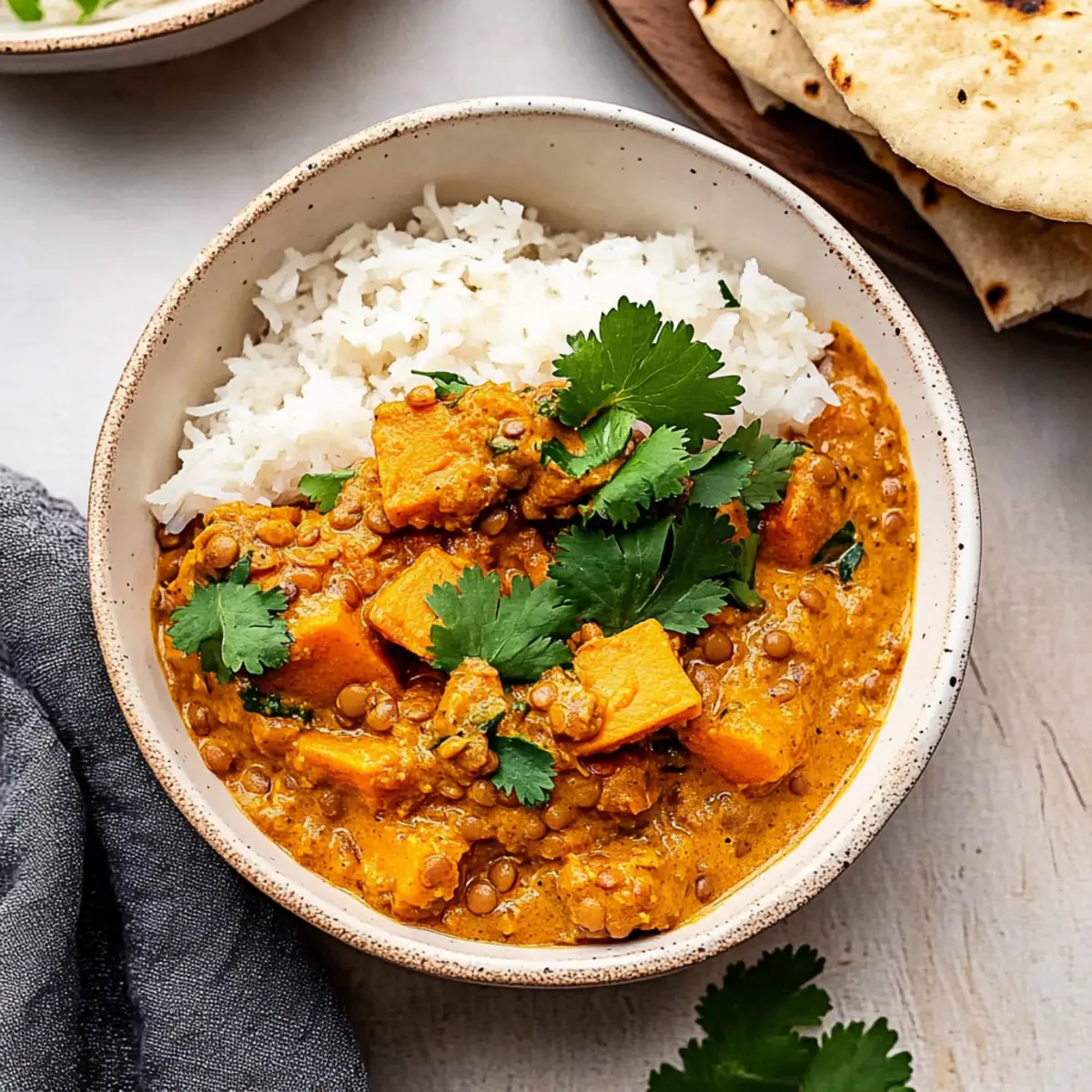 A flavorful and creamy vegan red lentil curry with sweet potatoes, perfect for a warm, comforting dinner.