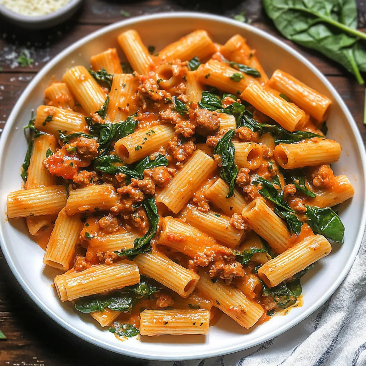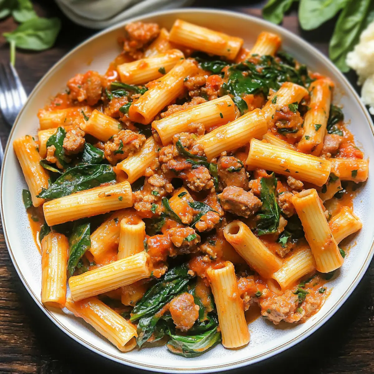 Making Creamy Sausage Rigatoni ahead of time is a fantastic way to streamline your meal prep. You can cook the pasta al dente and refrigerate it for up to 3 days, storing it in an airtight container. Alternatively, prepare the sausage mixture (steps 1-4) and keep it in the fridge for up to 24 hours; just be sure to let it cool first to maintain its texture. When you’re ready to serve, simply reheat the sausage mixture on the stove while adding the spinach (step 6) and any additional liquids if needed. This approach ensures you enjoy delicious, comforting pasta with minimal effort during your busy week!