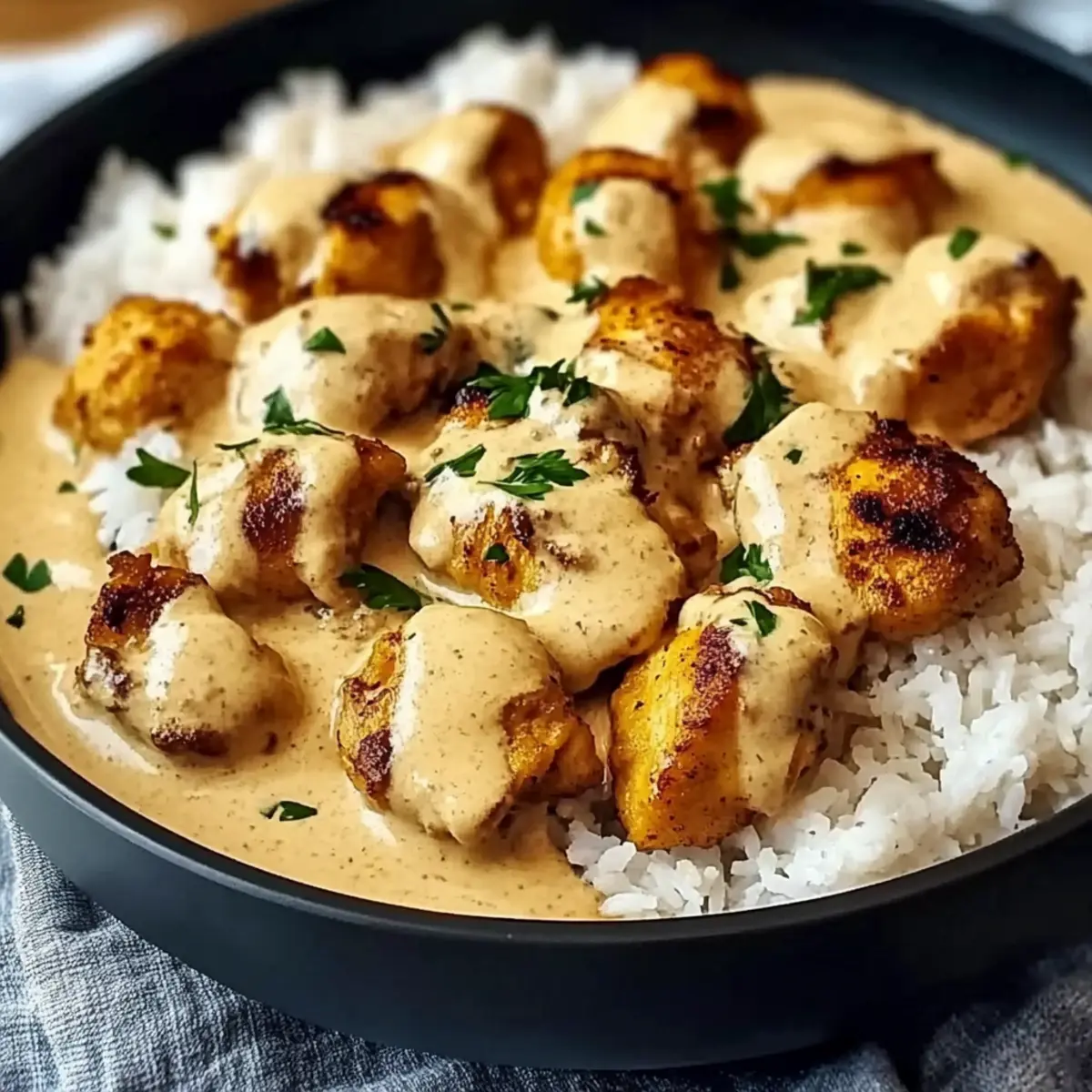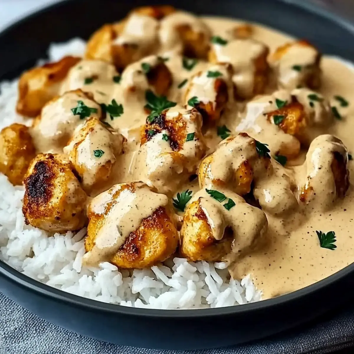 Once done, fluff the cooked rice with a fork and plate it generously on serving dishes. Top each portion with the creamy smothered chicken and the rich sauce, then sprinkle with freshly chopped parsley for a burst of color and flavor. Enjoy this comforting meal that brings warmth to your weeknight dinners!