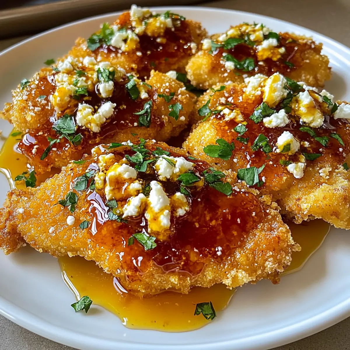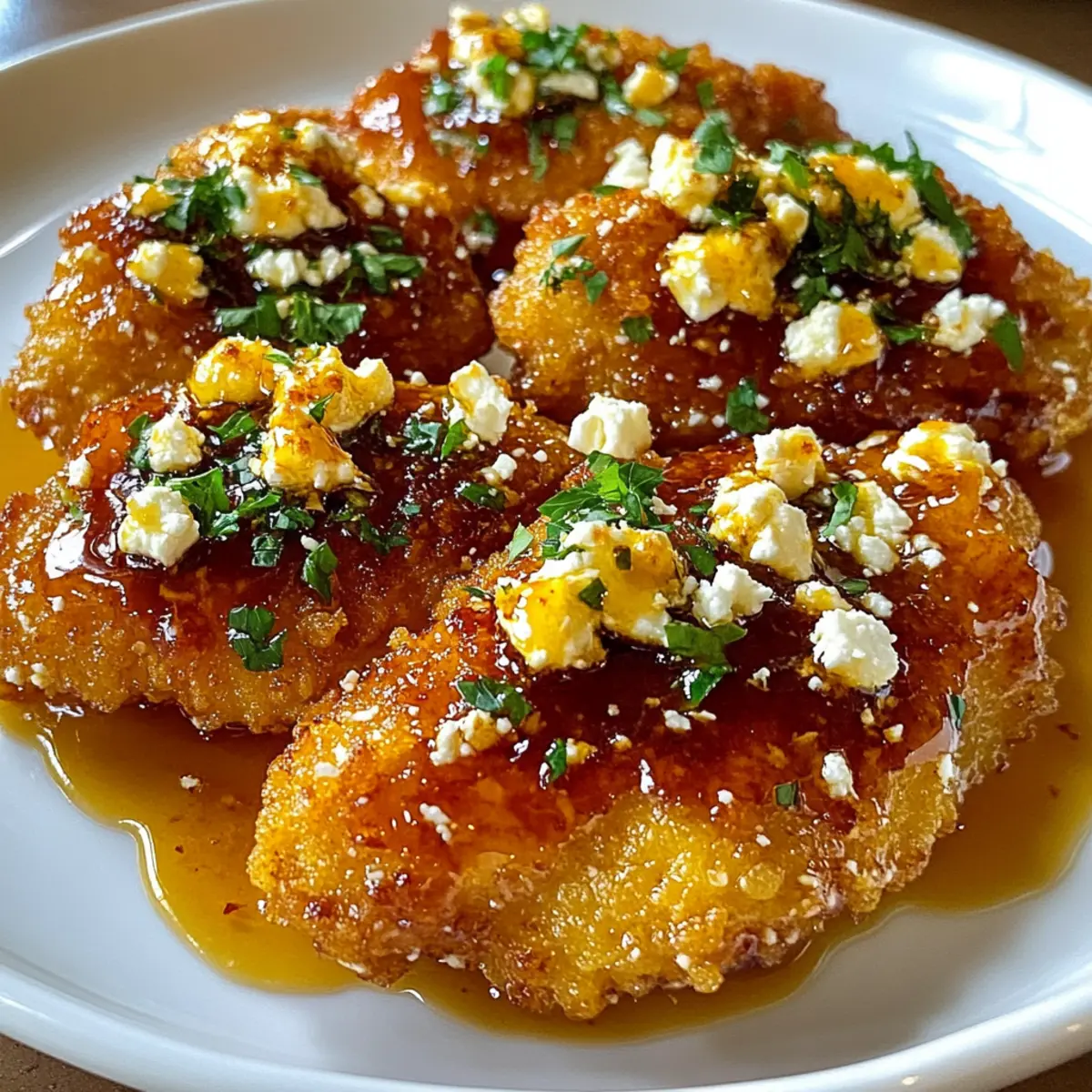 Before serving, sprinkle fresh parsley over the glazed chicken for an attractive burst of color. This simple garnish elevates the dish’s presentation while adding a hint of freshness. Now, your Crispy Hot Honey Feta Chicken is ready to enjoy at the dinner table!