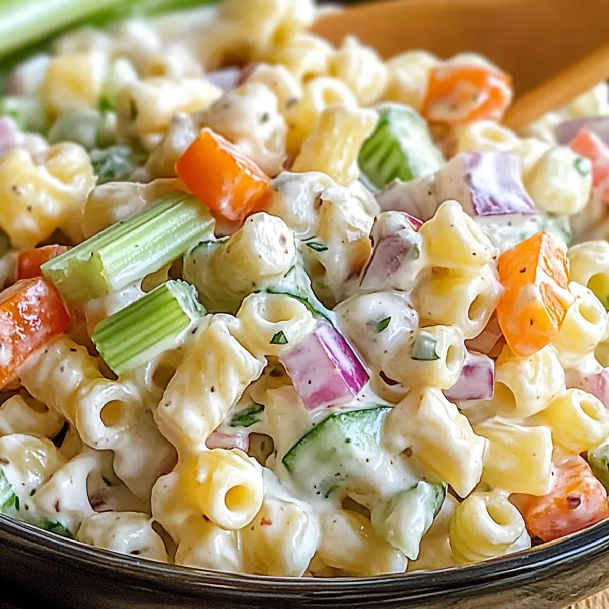 - In a large mixing bowl, combine the cooled ditalini pasta with chopped celery, diced bell peppers, finely chopped onion, and diced cucumber.