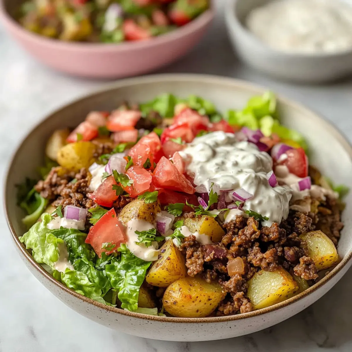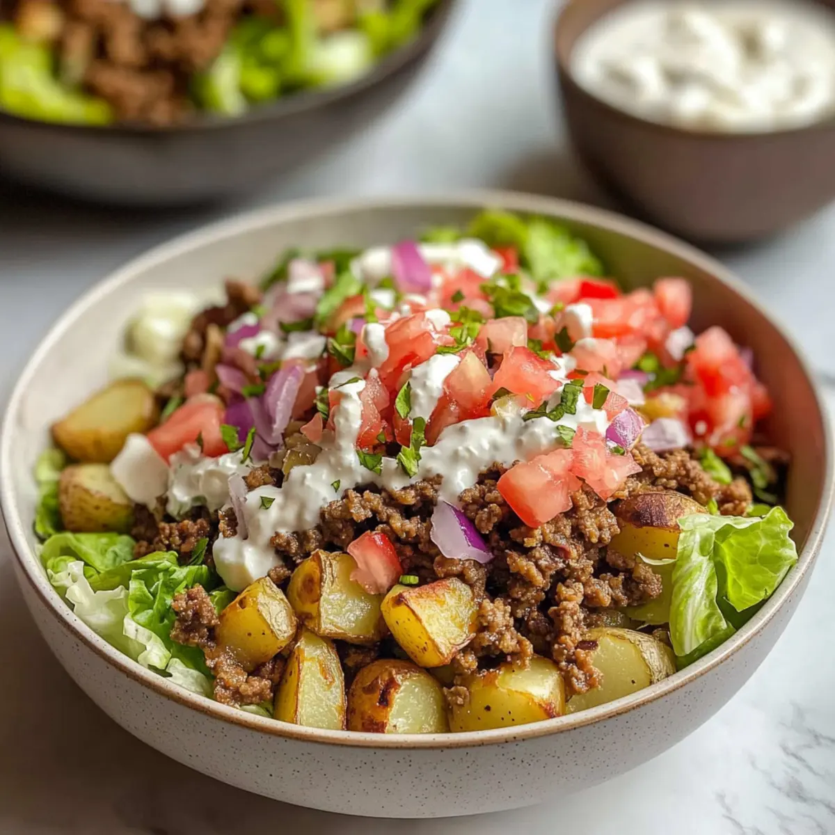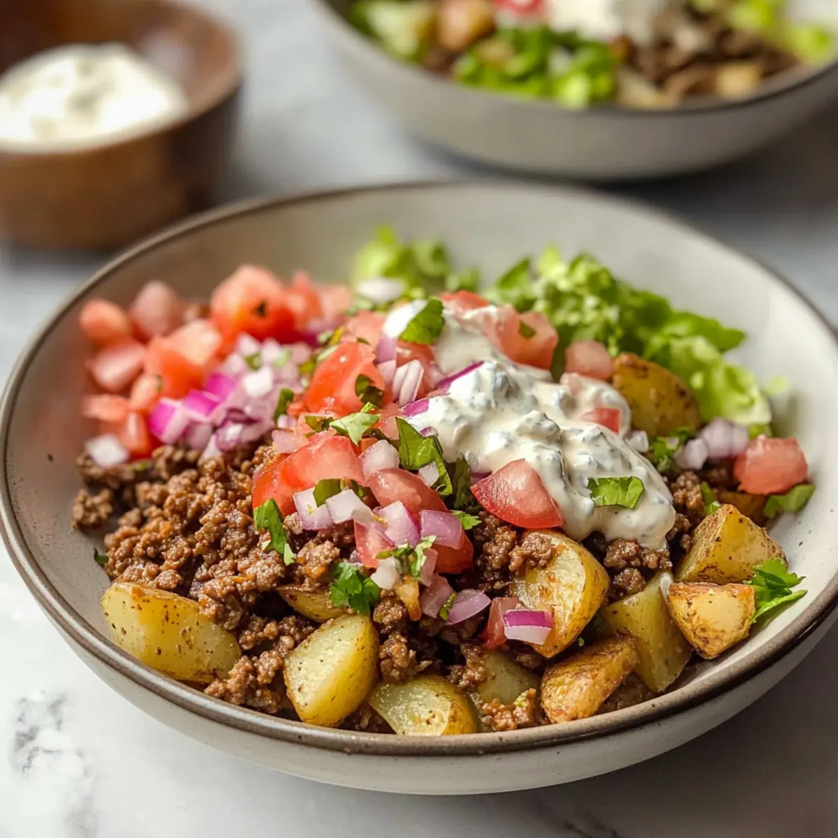To create your delicious Protein-Packed Potato Taco Bowls, start by layering the crispy roasted potatoes on the bottom of the bowls. Next, add a generous portion of the seasoned ground beef, followed by chopped Roma tomatoes, shredded iceberg lettuce, and crumbled cotija cheese. Top with tangy pickled onions and a drizzle of the yogurt sauce for a burst of flavor.