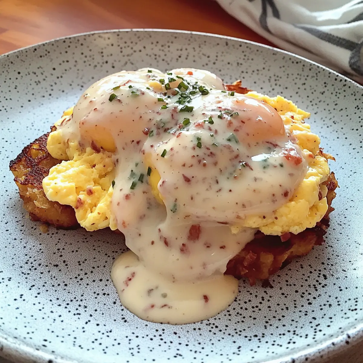 Comforting Flavors: This recipe blends crispy hash browns with fluffy scrambled eggs, all enveloped in a rich bacon gravy that brings warmth and satisfaction to your breakfast table.