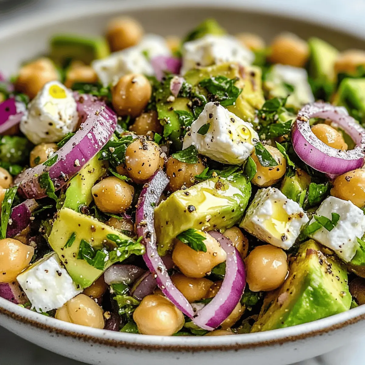 - In a large bowl, combine the drained chickpeas, diced avocado, crumbled feta, sliced red onion, chopped parsley, and mint.