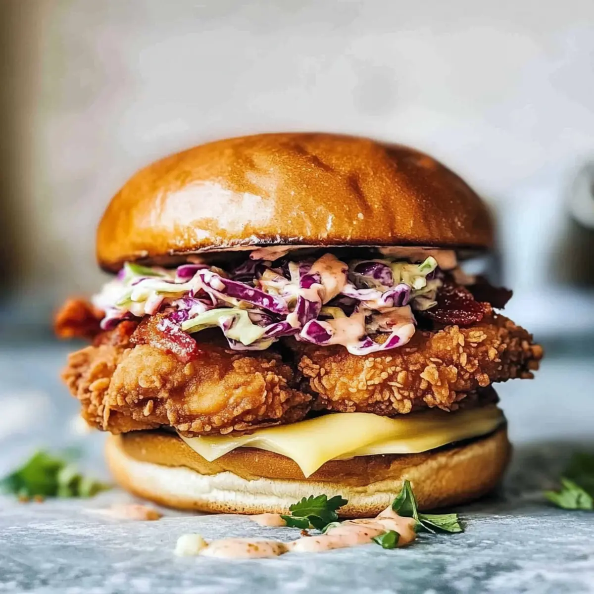 While the chicken rests, toast your brioche buns in a separate skillet with a little butter until golden brown. Start layering your sandwiches by placing a piece of fried chicken on the bottom half of each bun. Add a slice of Swiss cheese on top of the chicken, followed by crispy bacon, tangy slaw, and your choice of pickles to complete the flavor profile.