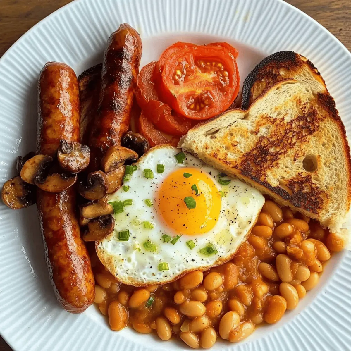 Now it’s time to plate your Full English Breakfast beautifully! Begin by placing the warm baked beans on one side of your plate. Next, arrange the crispy toasted bread alongside the sausages, cooked mushrooms, and juicy tomatoes. Finally, add the perfectly fried eggs on top, ensuring their golden yolks are visible. Garnish with finely chopped spring onions for an added touch of freshness and color before serving immediately.