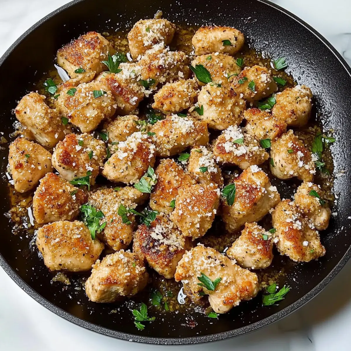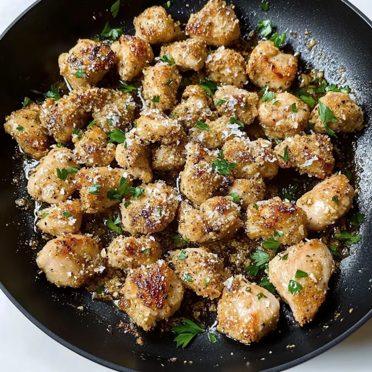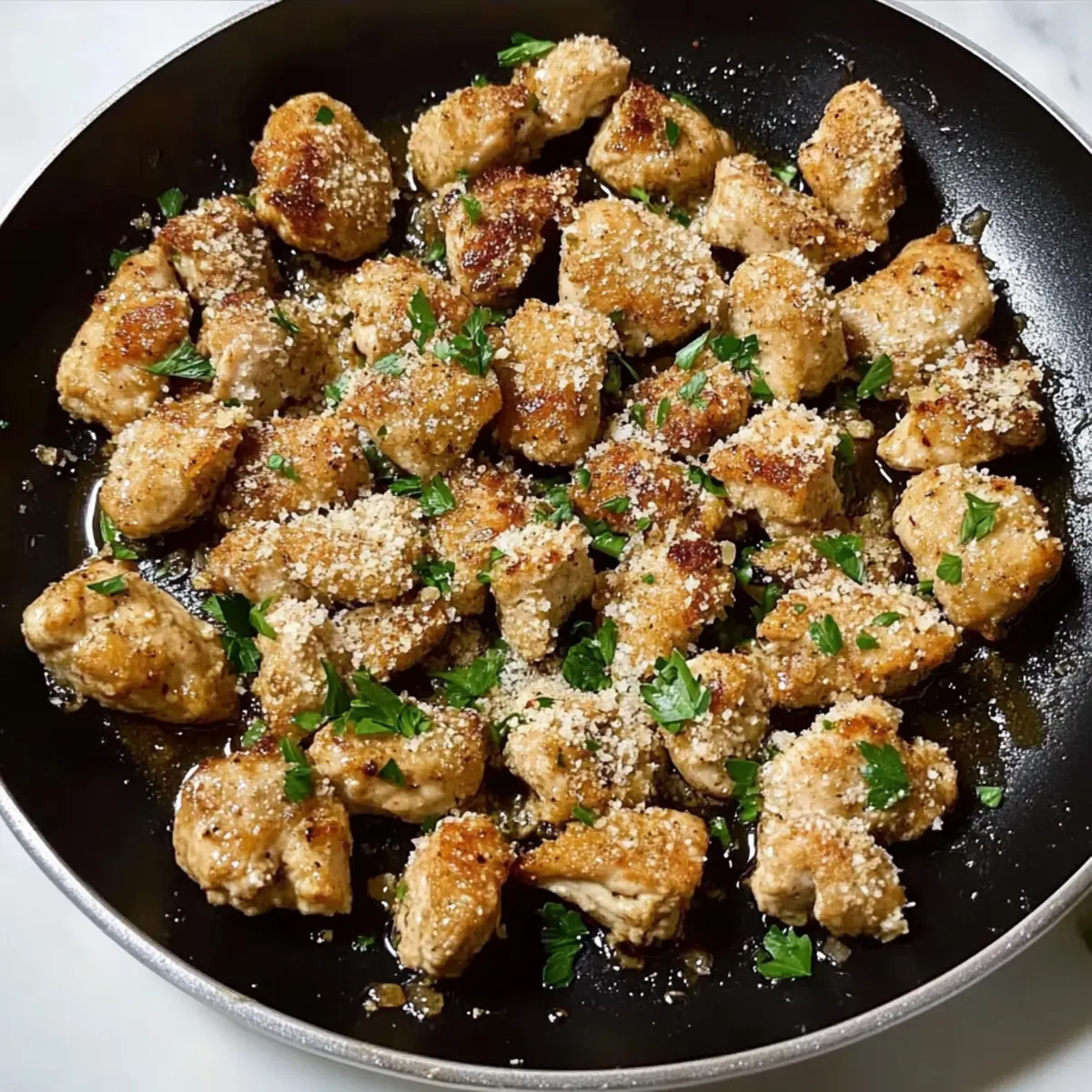Remove the skillet from heat and sprinkle in the grated Parmesan cheese and chopped parsley. Toss everything together until the chicken bites are well coated with the rich flavors. The heat will allow the cheese to melt slightly, creating a deliciously creamy coating.