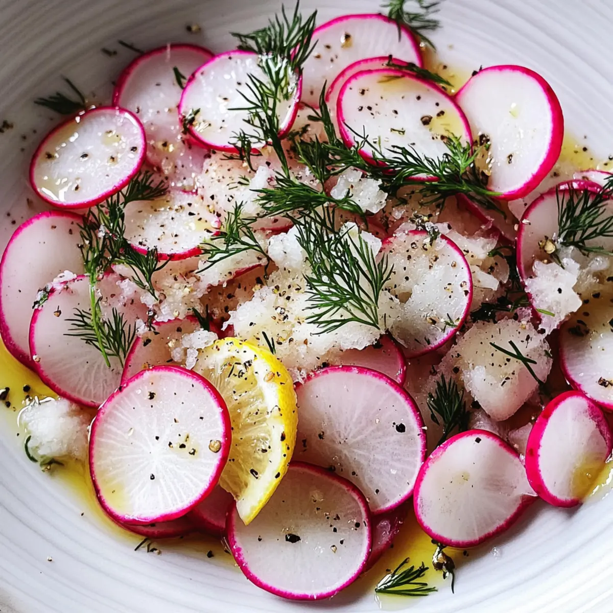- Artfully arrange the dressed radish slices on a serving platter, garnish with lemon zest, extra Parmesan, and black pepper.