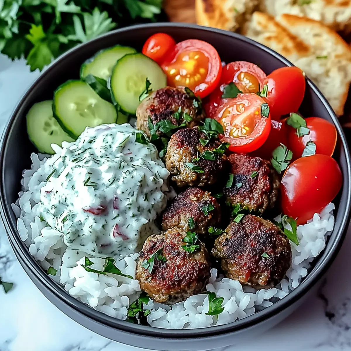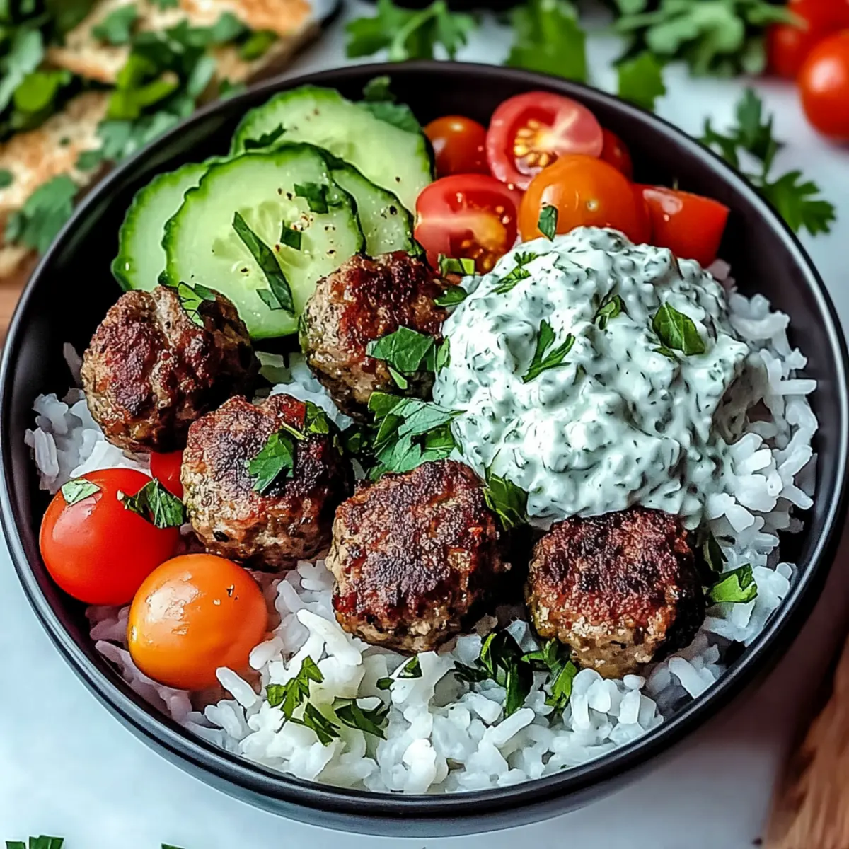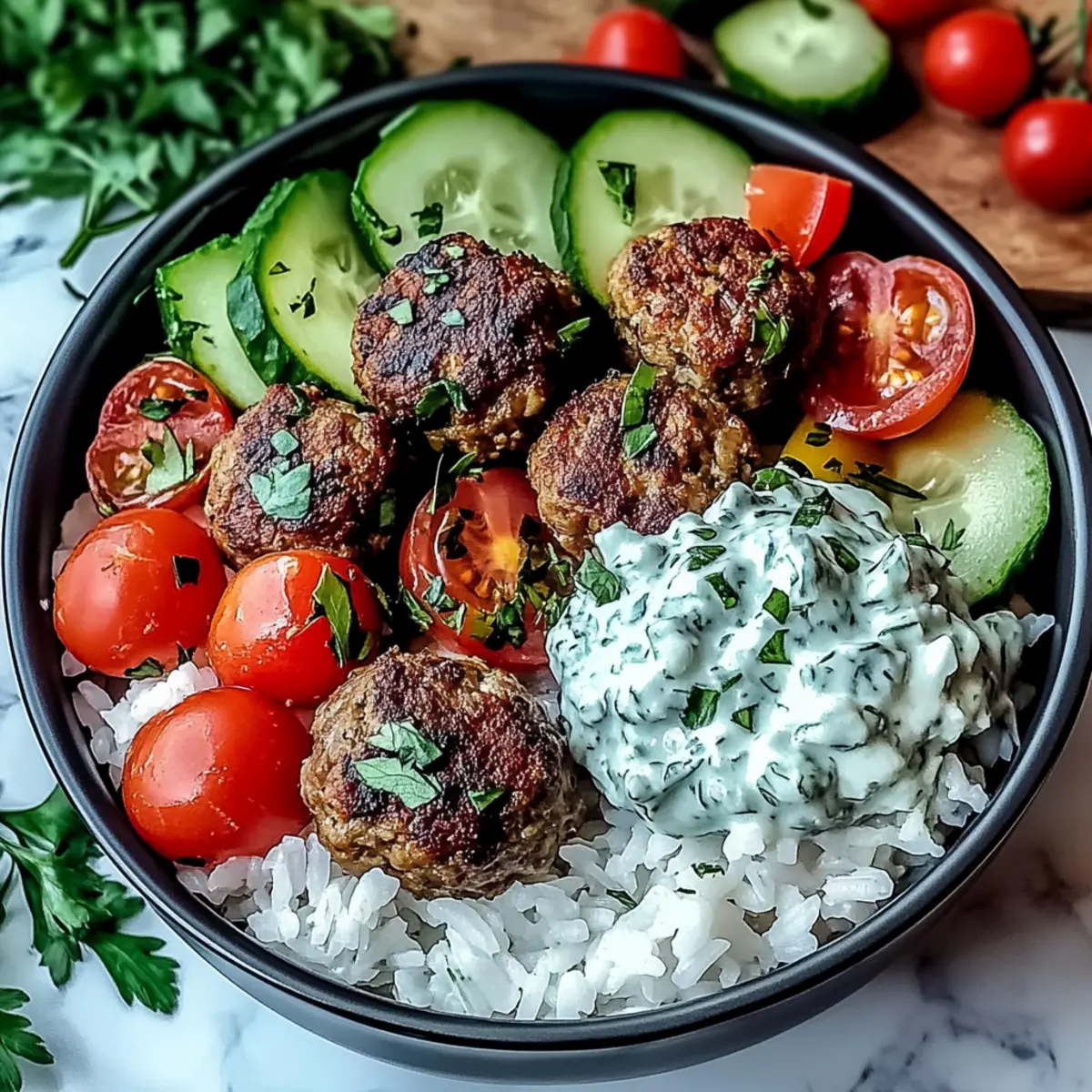 A delicious Greek Meatball Bowl featuring juicy meatballs, creamy tzatziki, and fresh veggies over fluffy rice, perfect for family dinners.