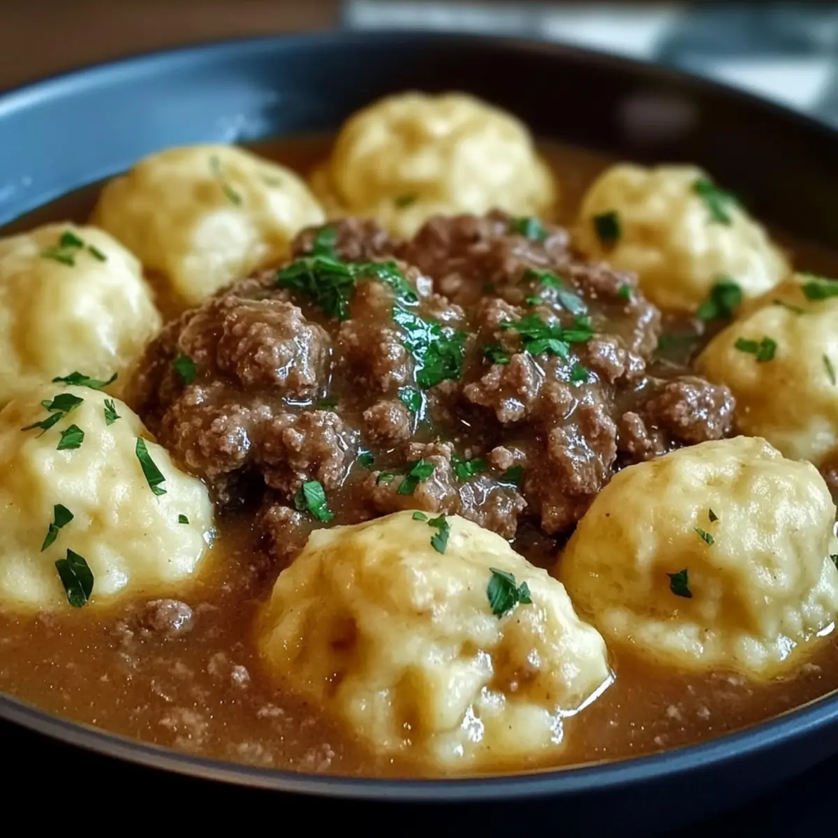 Remove the skillet from heat and let it sit for a couple of minutes. If desired, garnish with freshly chopped parsley for a pop of color. Serve the Hearty Ground Beef and Dumplings warm, allowing the rich, thick gravy and tender dumplings to bring comfort to your table.