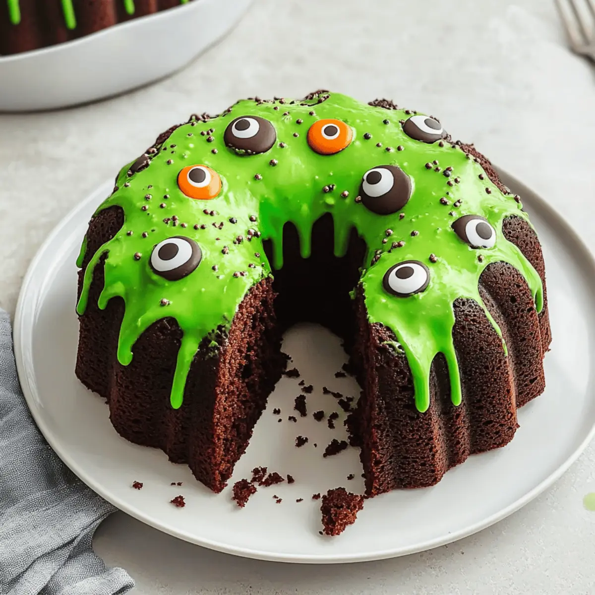 For those with gluten sensitivities, this Monster Halloween Bundt Cake can be made gluten-free by substituting all-purpose flour with a gluten-free flour blend. Additionally, always double-check the ingredients for any allergies, especially if you’re using store-bought candies for decorations, as they may contain allergens like nuts, dairy, or gluten.