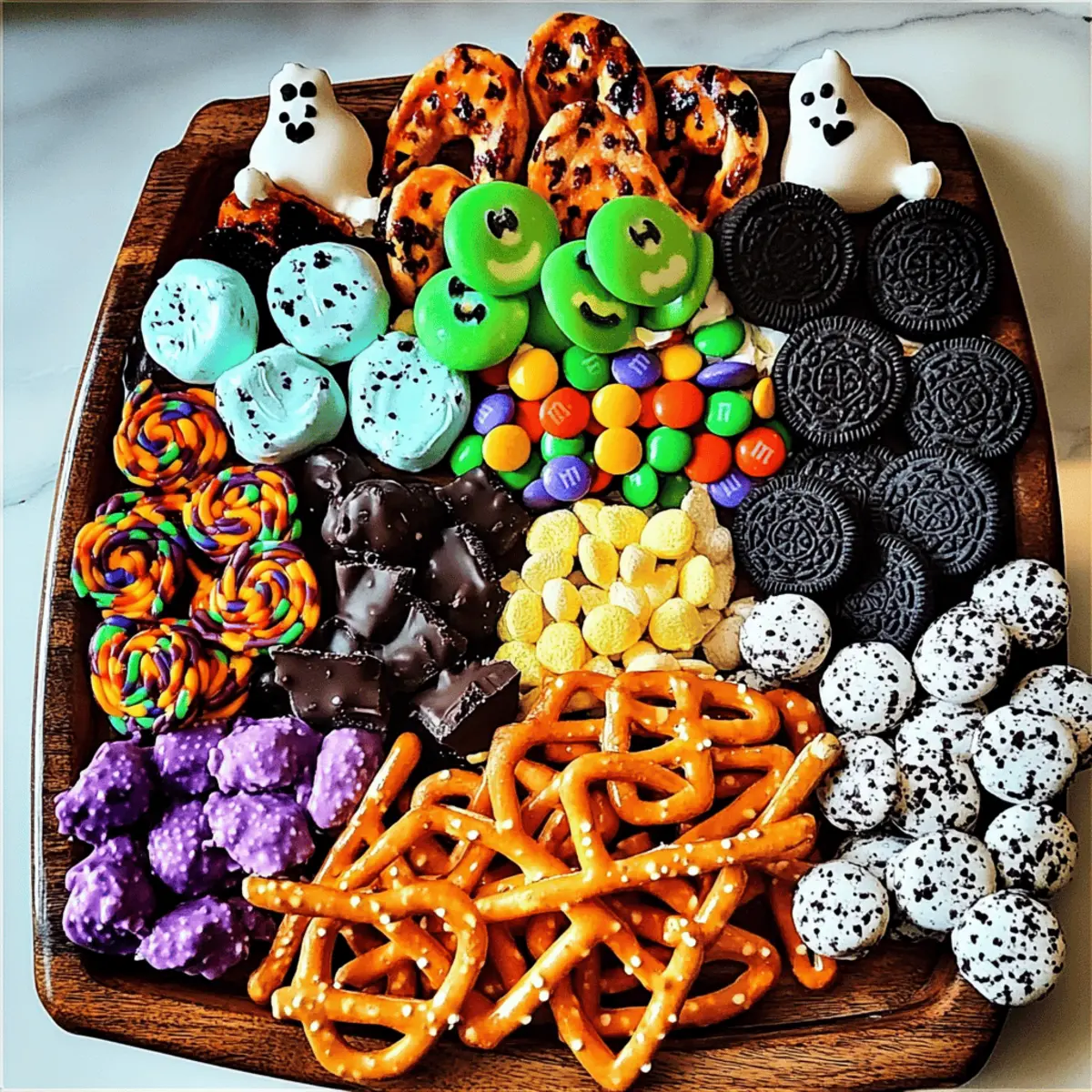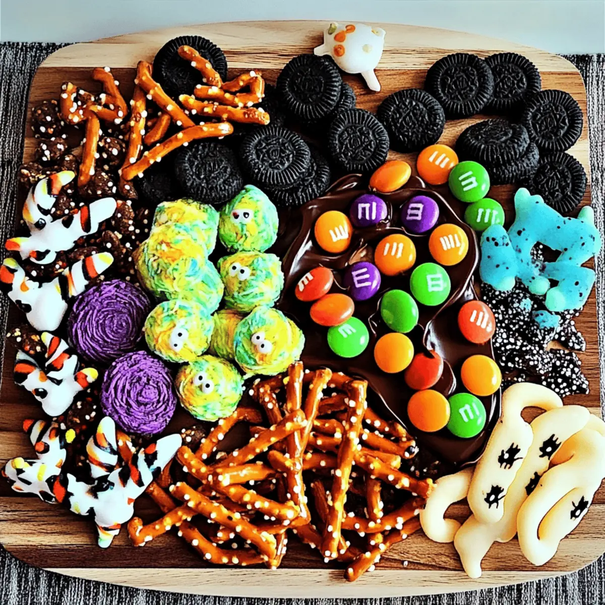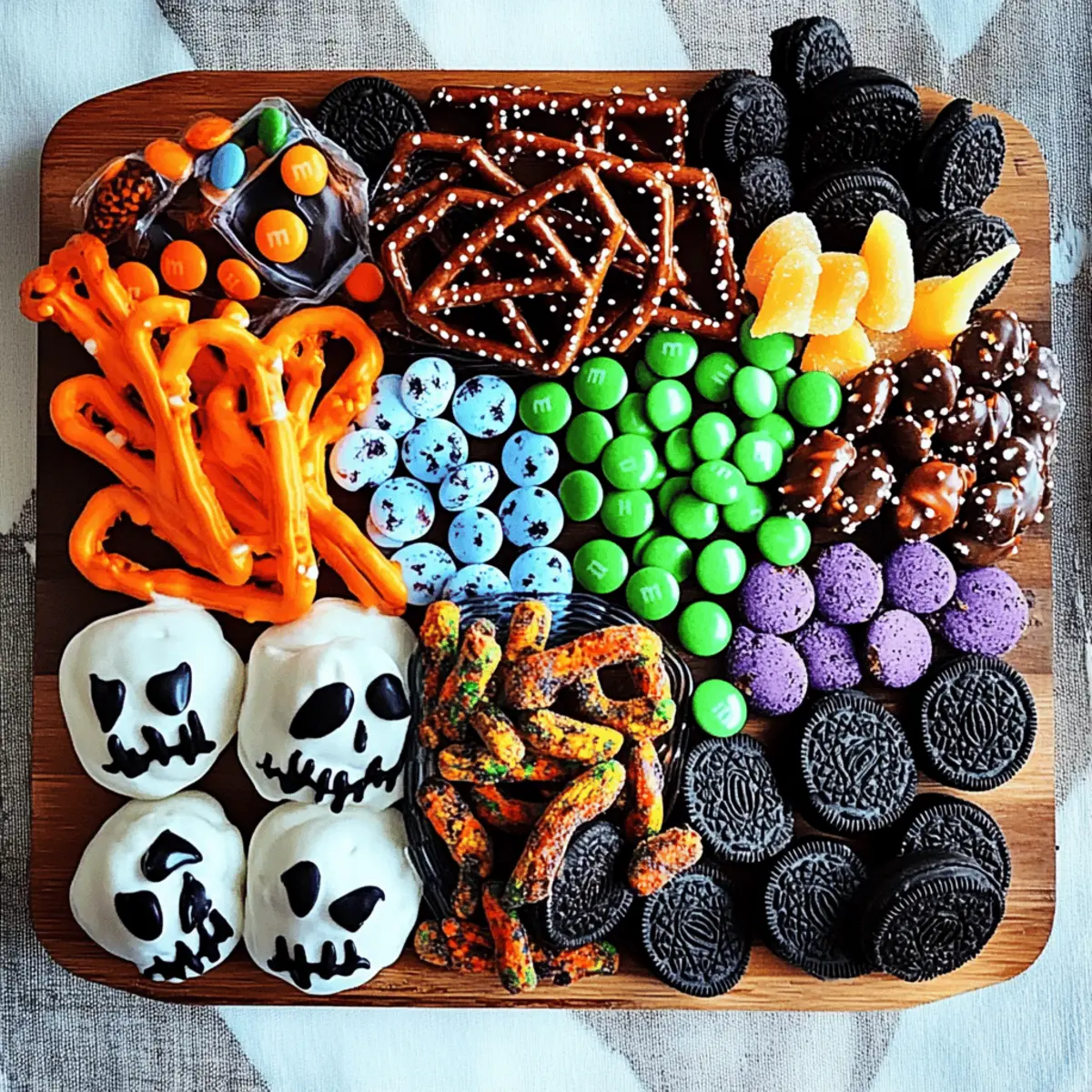 Preparing the Spooky-Cute Halloween Charcuterie Board in advance is a fantastic way to save time and reduce stress on the day of your celebration! You can assemble the board up to 24 hours ahead of time, but for best results, keep treat items like M&M’s, gummy worms, and Oreos separate until serving to maintain their texture. Store the perishable components in airtight containers in your refrigerator, ensuring freshness. When you’re ready to serve, simply arrange the treats on your board, adding any chocolate drizzle or sprinkles for a final festive touch right before your guests arrive. This not only makes for a stunning presentation but also ensures your Halloween Charcuterie Board is just as delightful as it would be freshly made!