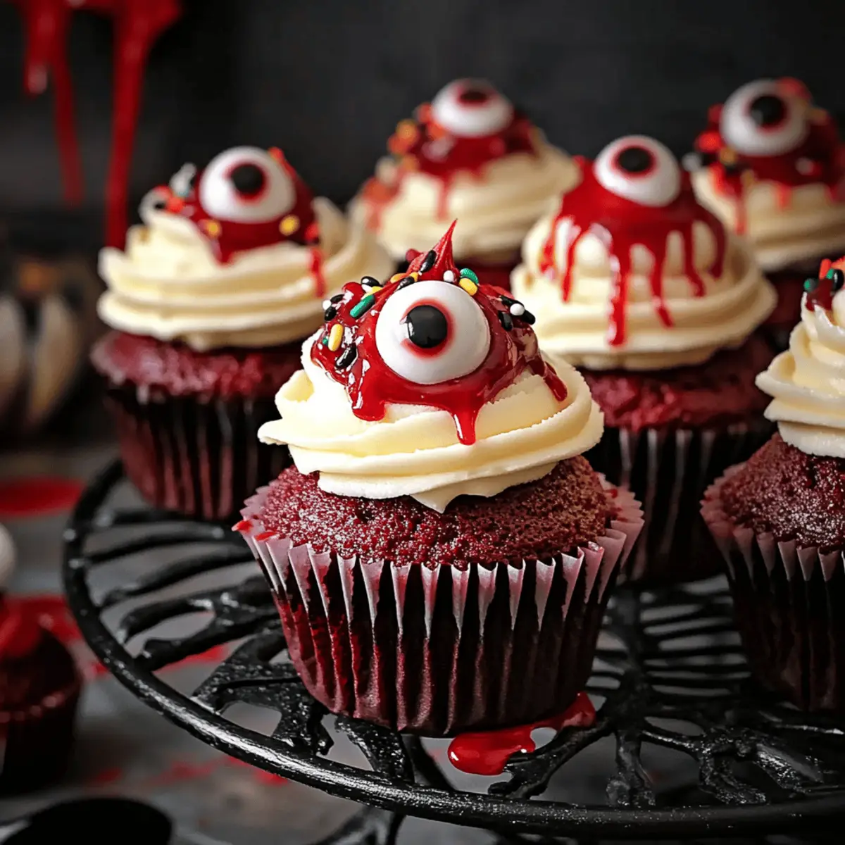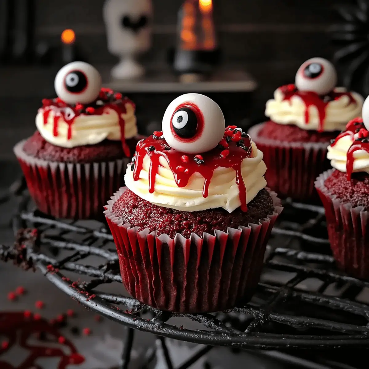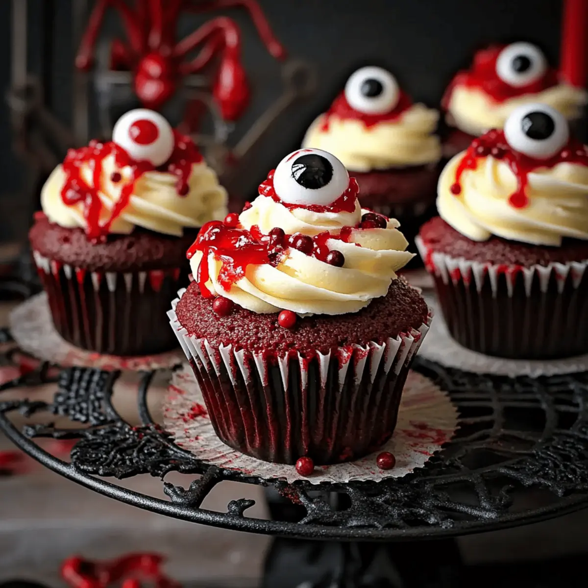 Creative Decorations: Themed Toppings: Use a variety of decorations like candy eyeballs and red gel for fun designs, making your Halloween Red Velvet Cupcakes even more festive!