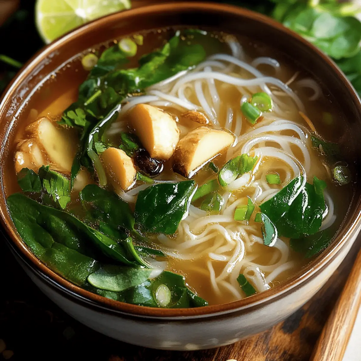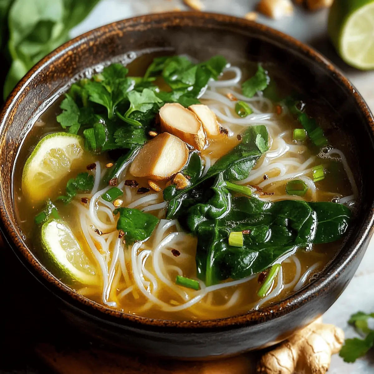 In serving bowls, place a generous portion of the cooked noodles first, adding the prepared greens and protein on top. Ladle the steaming hot broth over the ingredients, ensuring everything is nestled in that robust liquid. Finish off by garnishing with fresh cilantro and lime wedges for an extra zing, creating a comforting bowl of Healing Ginger Garlic Broth with Rice Noodles.