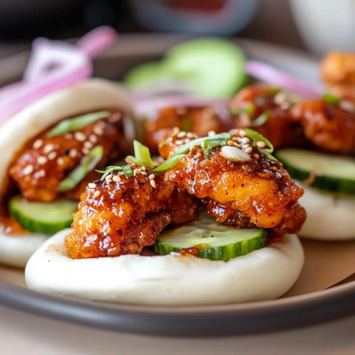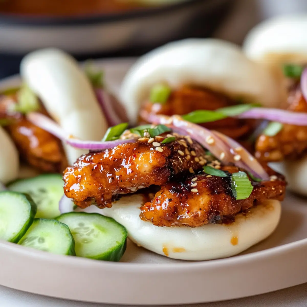 - Assemble Bao: Spread creamy sesame sauce in buns, add glazed chicken, cucumber, onion, and sesame seeds. Serve immediately.