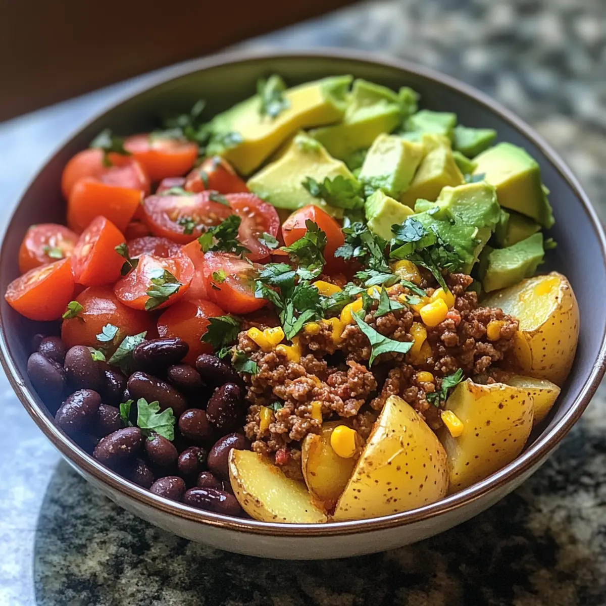 Sprinkle a generous amount of shredded cheddar cheese over each bowl, allowing it to melt slightly from the heat of the meat and potatoes. Enhance your Loaded Potato Taco Bowl with colorful toppings, such as halved cherry tomatoes, creamy avocado slices, and a handful of fresh cilantro, adding vibrancy and freshness to the dish.