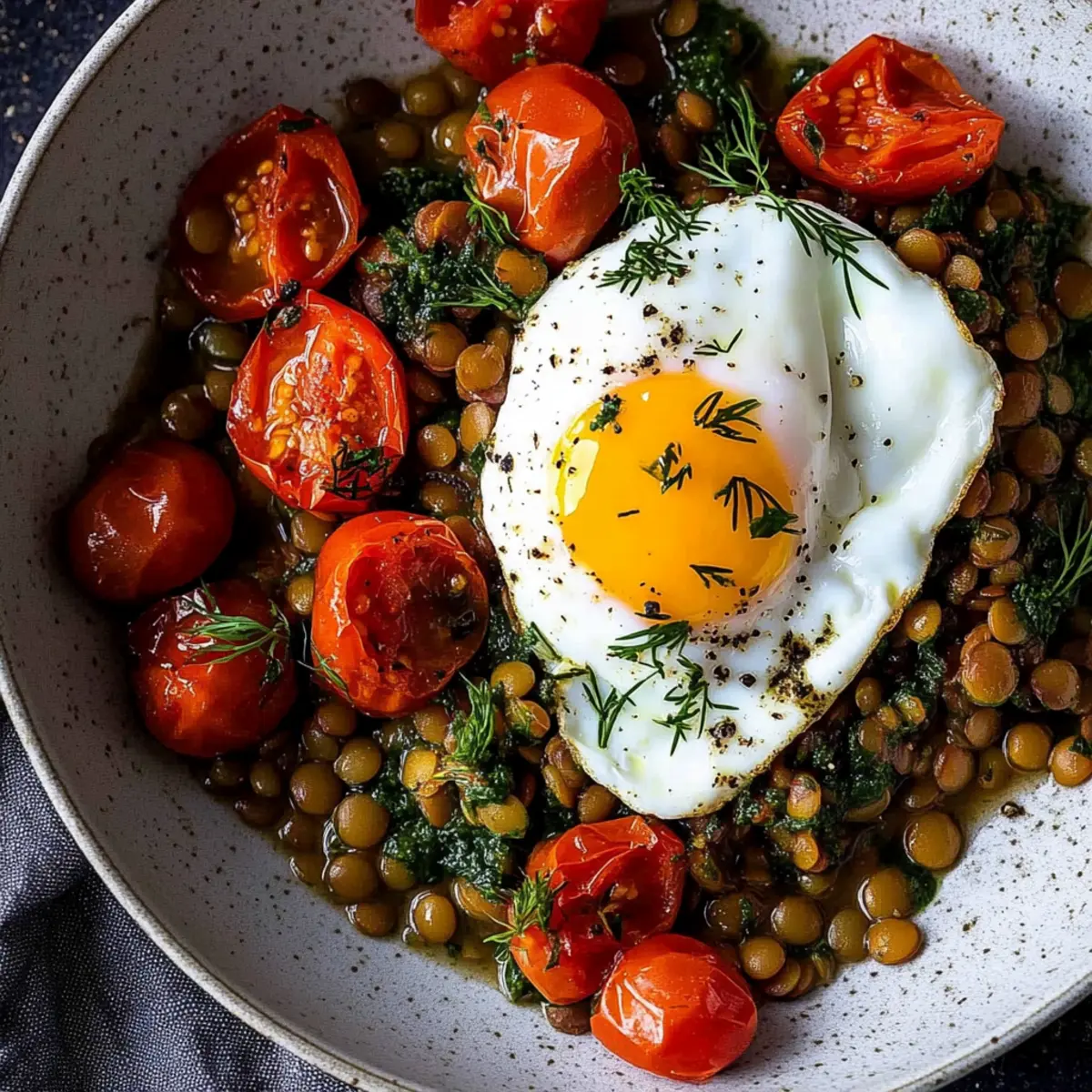This Mediterranean Braised Lentils recipe offers a hearty vegetarian twist, featuring protein-rich lentils, vibrant tomatoes, and creamy poached eggs for a nourishing meal.