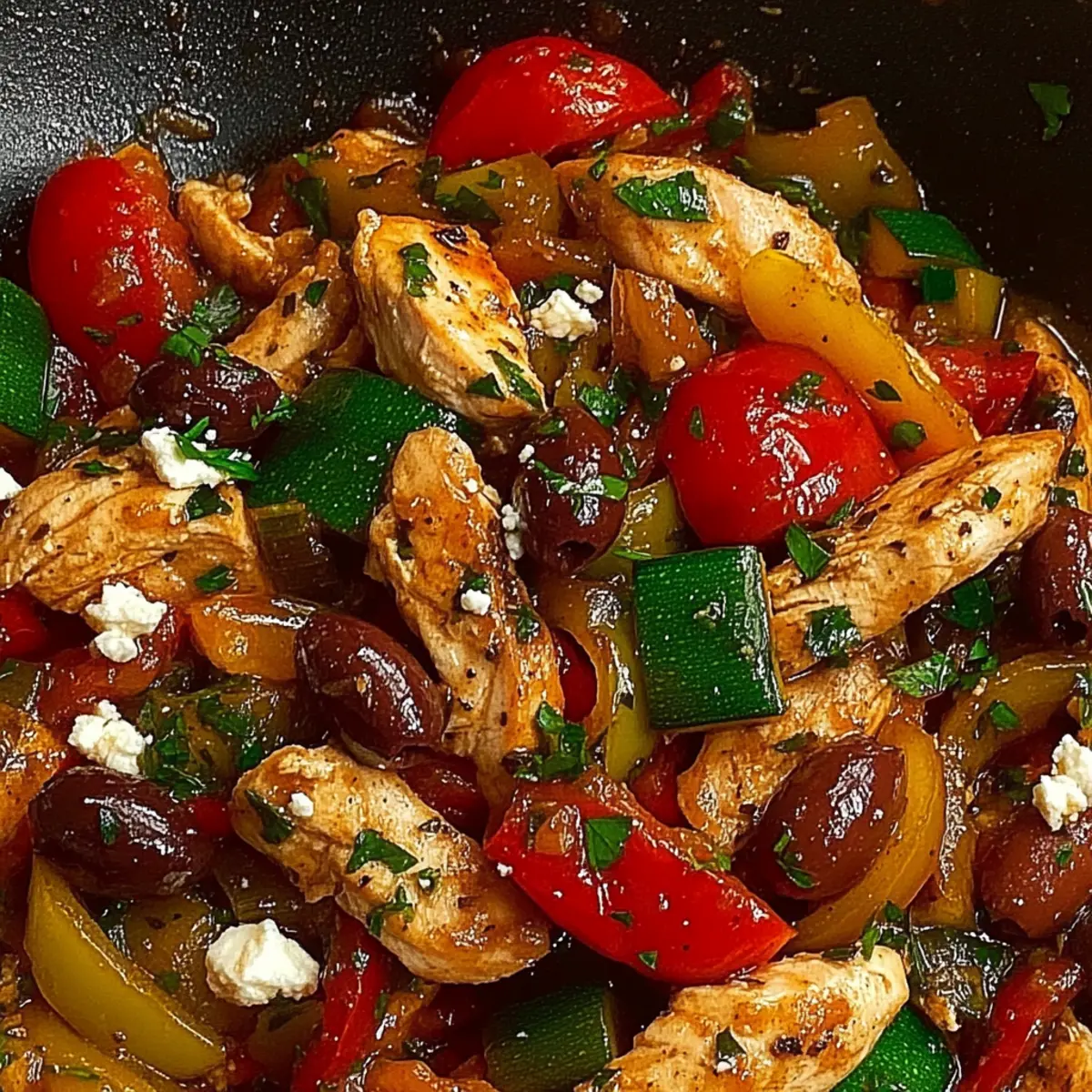 Squeeze fresh lemon juice over the Mediterranean Chicken Stir Fry, brightening the flavors beautifully. Gently fold in the pitted Kalamata olives and crumbled feta cheese, mixing until just combined. The cheese will slightly melt and enhance the creamy texture.