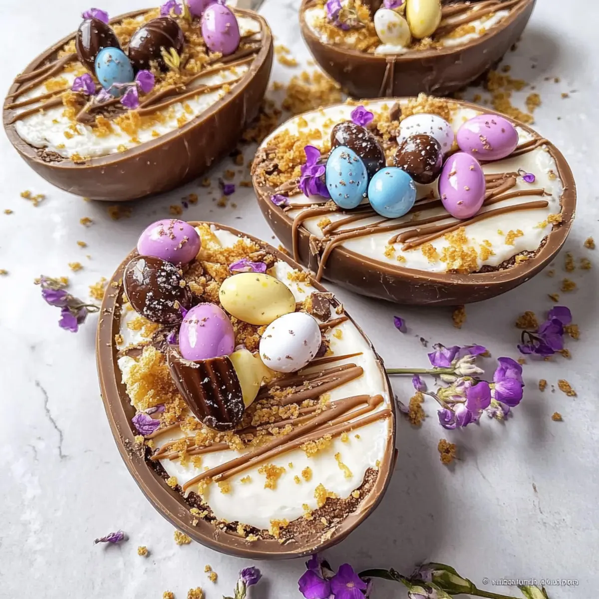 Melt chocolate in the microwave or a heatproof bowl set over simmering water, then drizzle it over each cheesecake-filled egg. Next, top with adorable mini chocolate eggs for a delightful finish. Once decorated, chill in the refrigerator for at least 2 hours, allowing the cheesecake to set properly.
