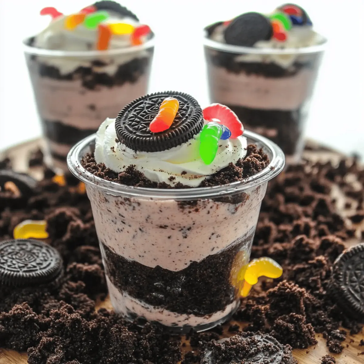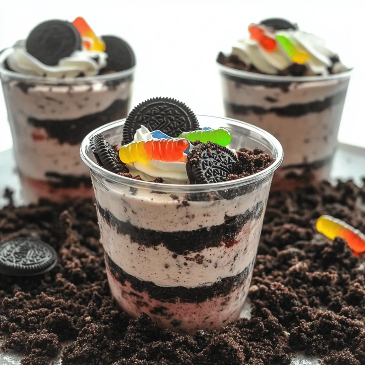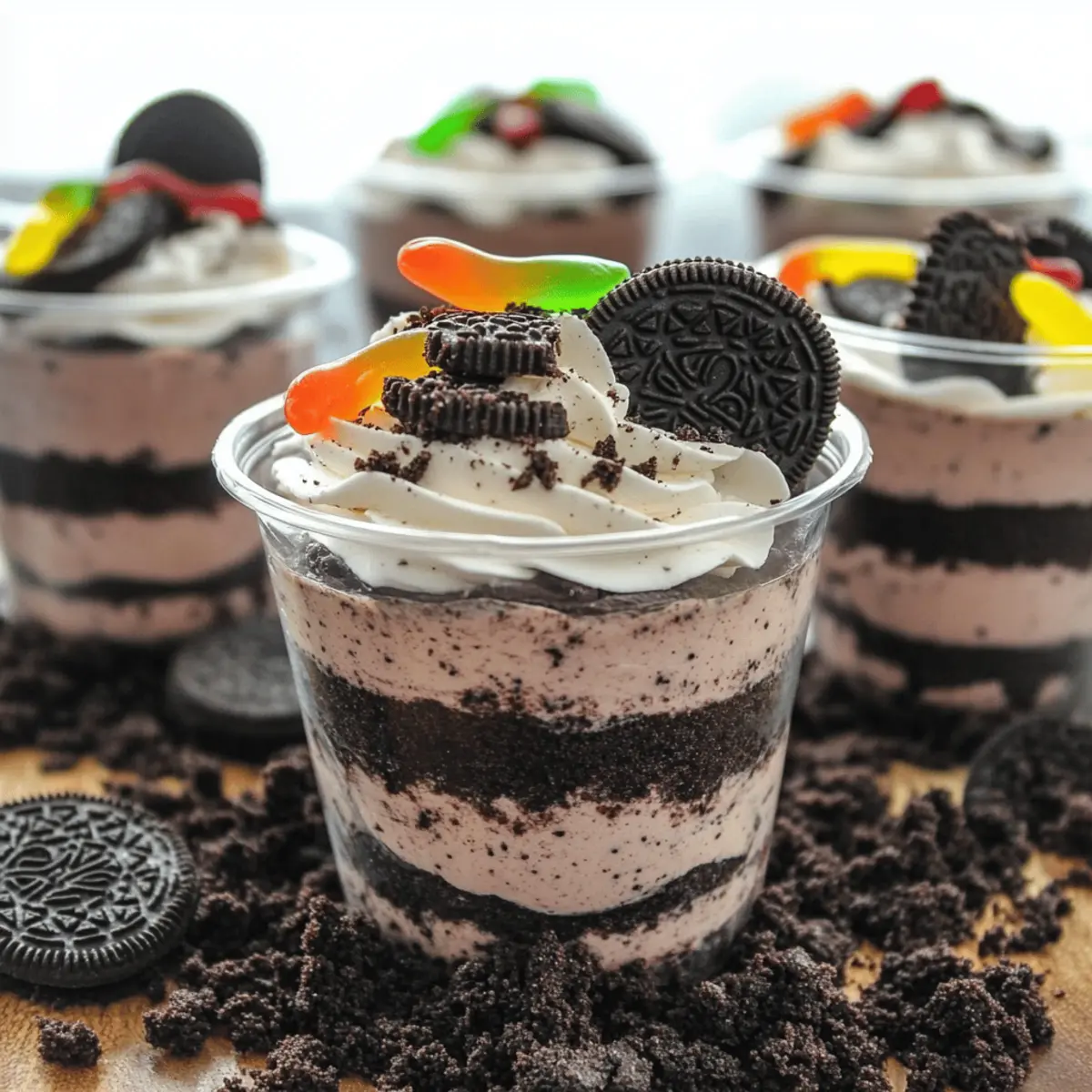 6. Garnish with gummy worms and Oreo crumbs, then refrigerate for 1 hour before serving.