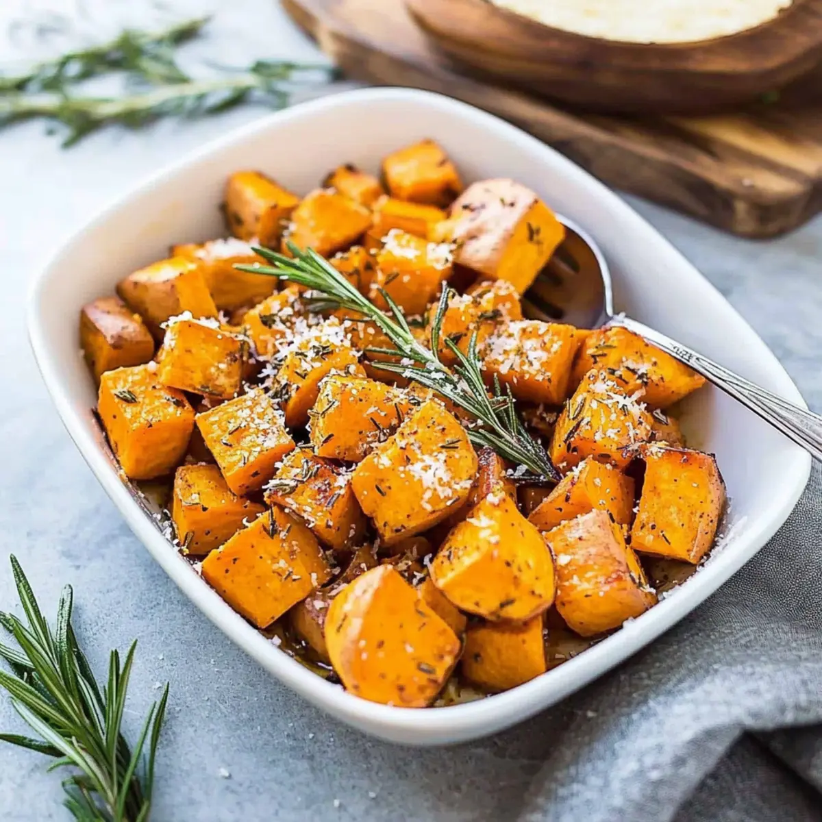 Once your sweet potatoes are tender and have a rich golden-brown caramelization, remove them from the oven. Allow them to cool for about 5 minutes before adding a generous sprinkle of freshly grated parmesan cheese. Gently toss the warm sweet potatoes to coat them in cheesy goodness before serving.