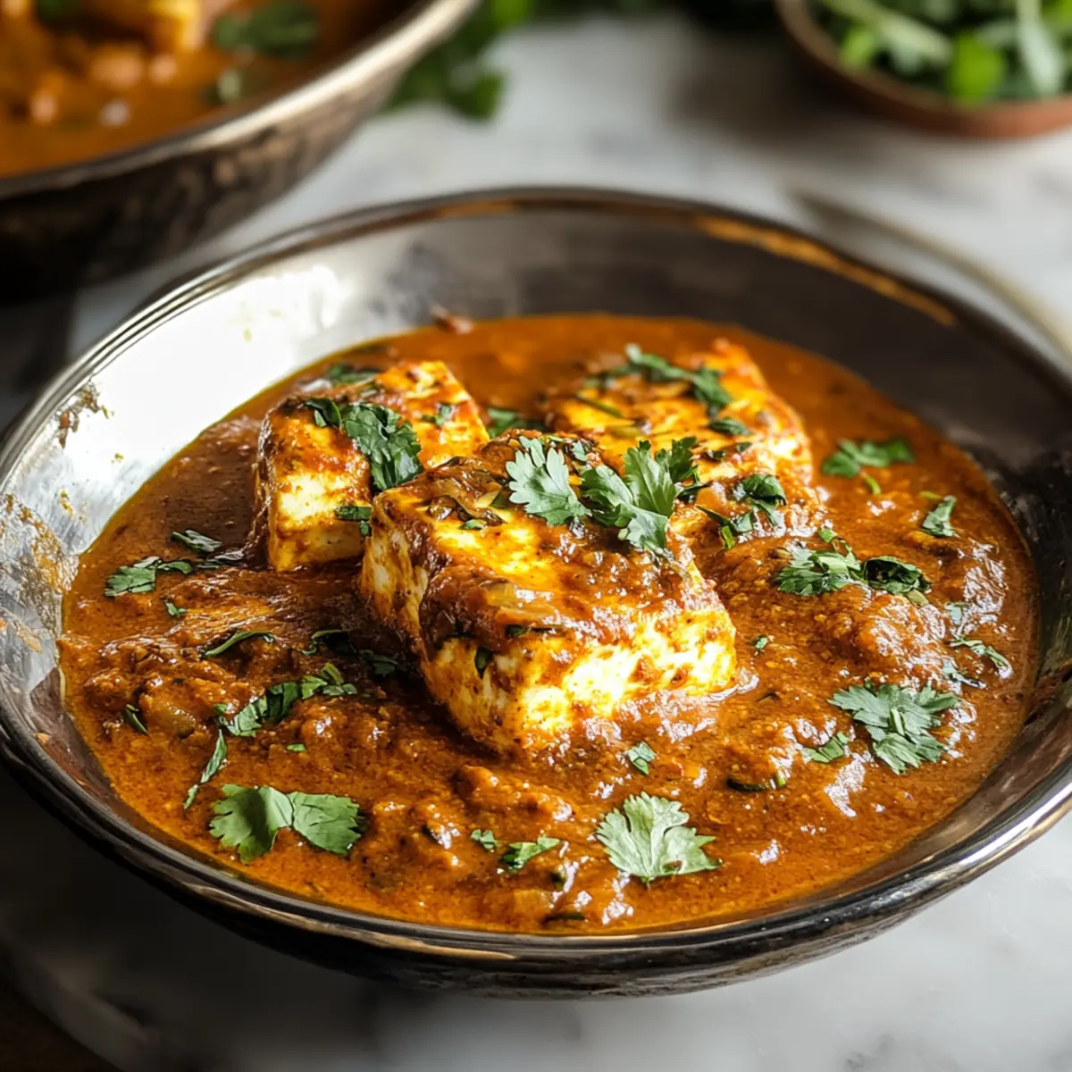 Once completed, turn off the heat and garnish your Paneer Musallam with freshly chopped cilantro. Serve it hot with naan or steamed basmati rice for a truly rich meal. The vibrant colors and enticing aroma will surely impress your guests and elevate any occasion!