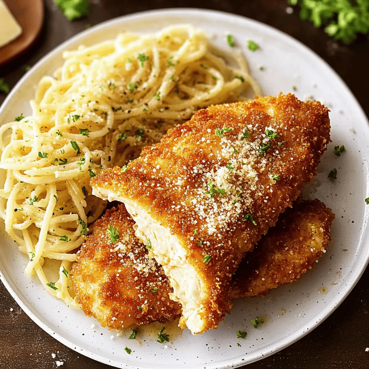 Creamy Alfredo Pasta: Tossed with fettuccine, this rich, cheesy sauce creates a luxurious pairing for the chicken. The creamy texture mirrors the juiciness of the chicken, creating an irresistible combination.