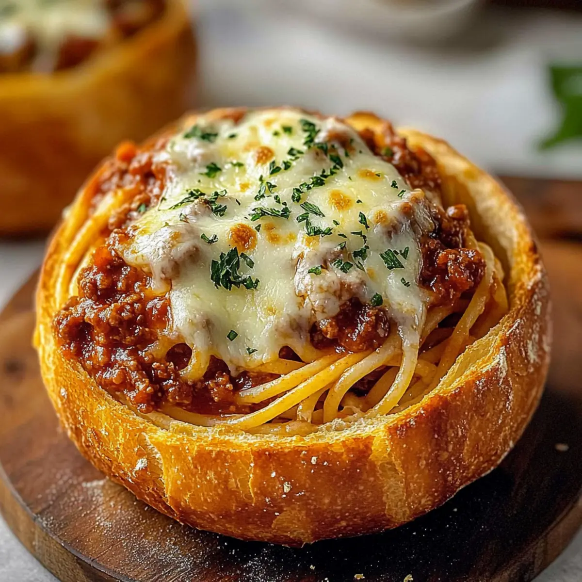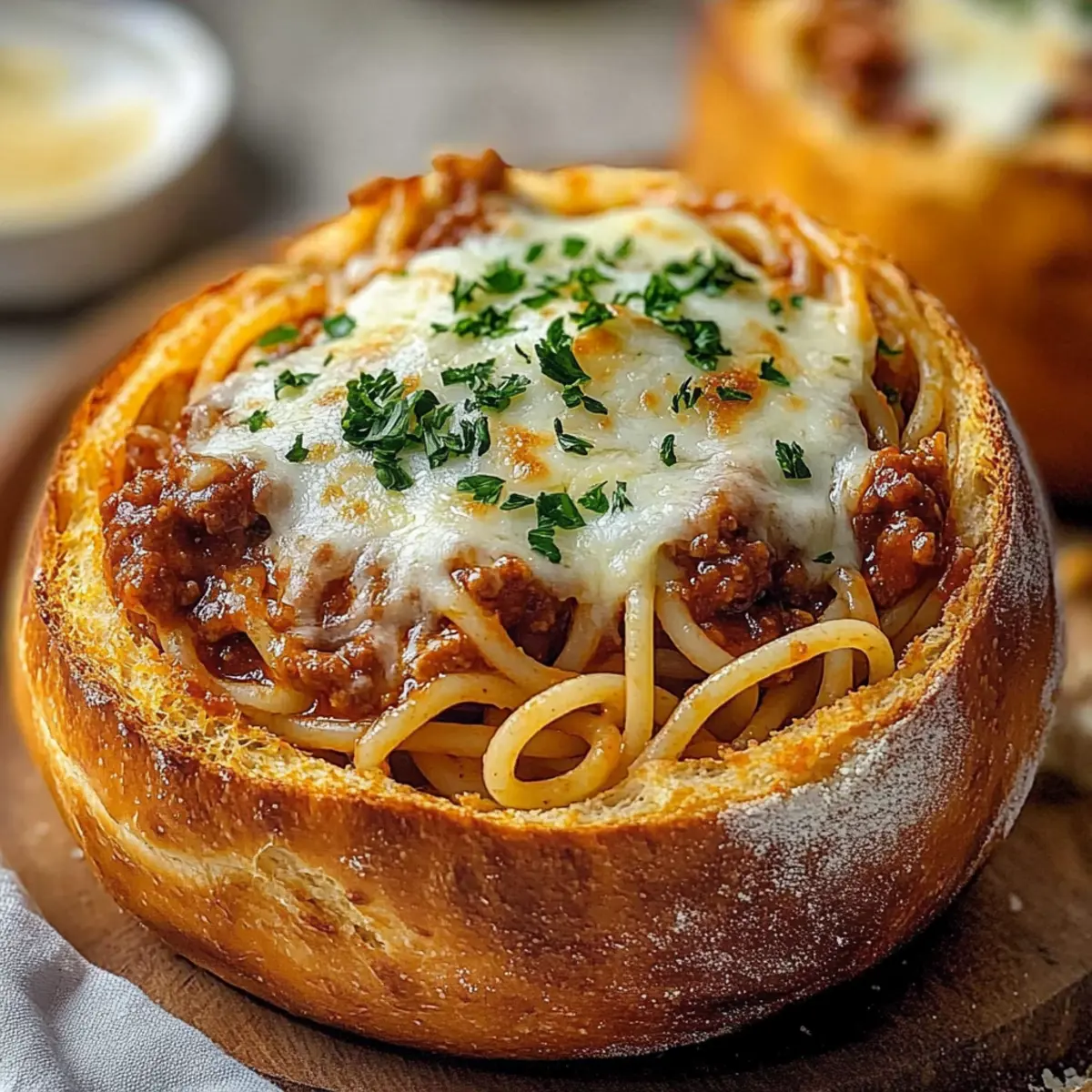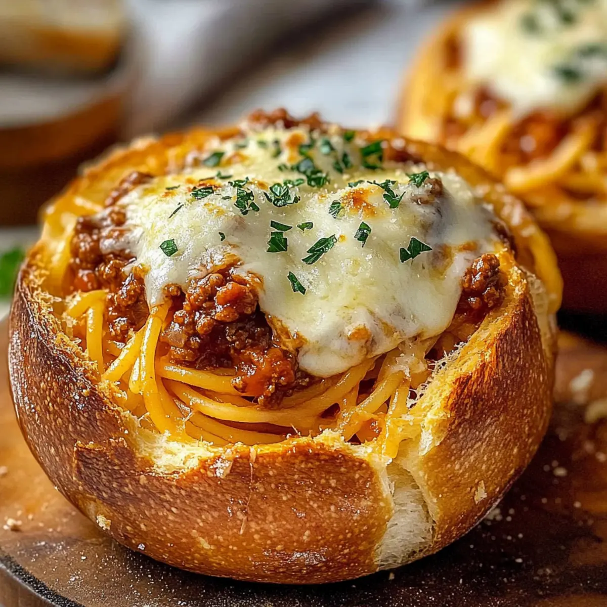 - Preheat your oven to 180°C (350°F). Fill each garlic buttered bread bowl with saucy spaghetti, top with mozzarella, and place on a baking sheet. Bake for 8-10 minutes until cheese is bubbly and bread is crispy.