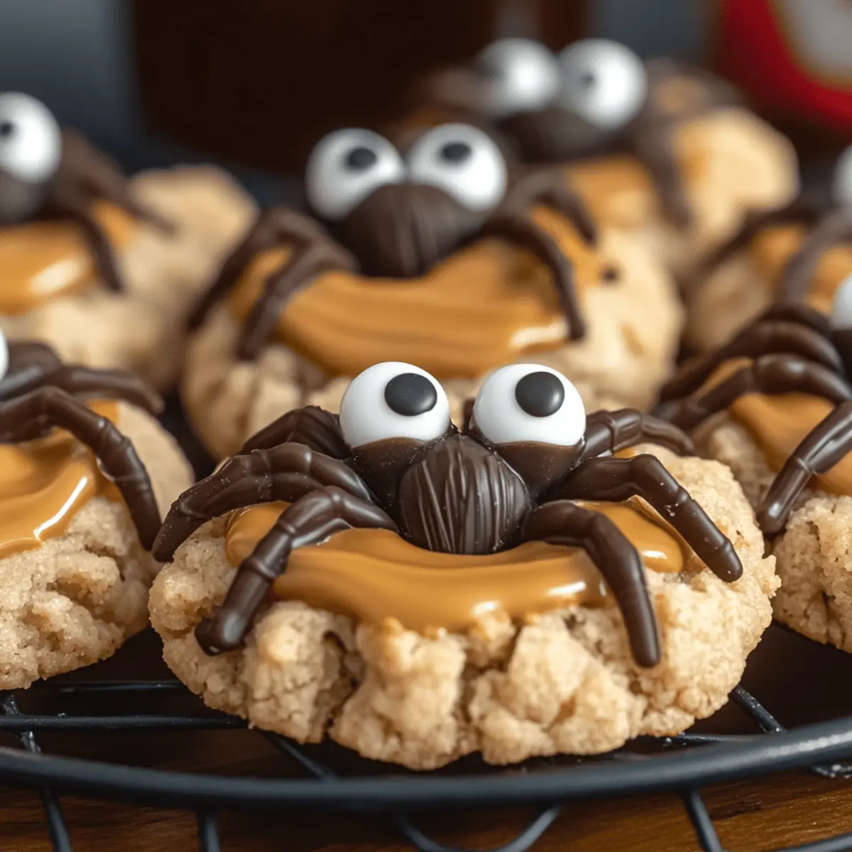 Allow the cookies to cool on the baking sheet for 15-20 minutes. Once cooled, press a frozen mini Reese’s cup into the center of each cookie. Melt ½ cup of semi-sweet chocolate chips in a microwave or double boiler, then use a piping bag or a fork to draw spider legs on each cookie and attach candy eyeballs. Your Peanut Butter Spider Cookies are now ready to amaze!