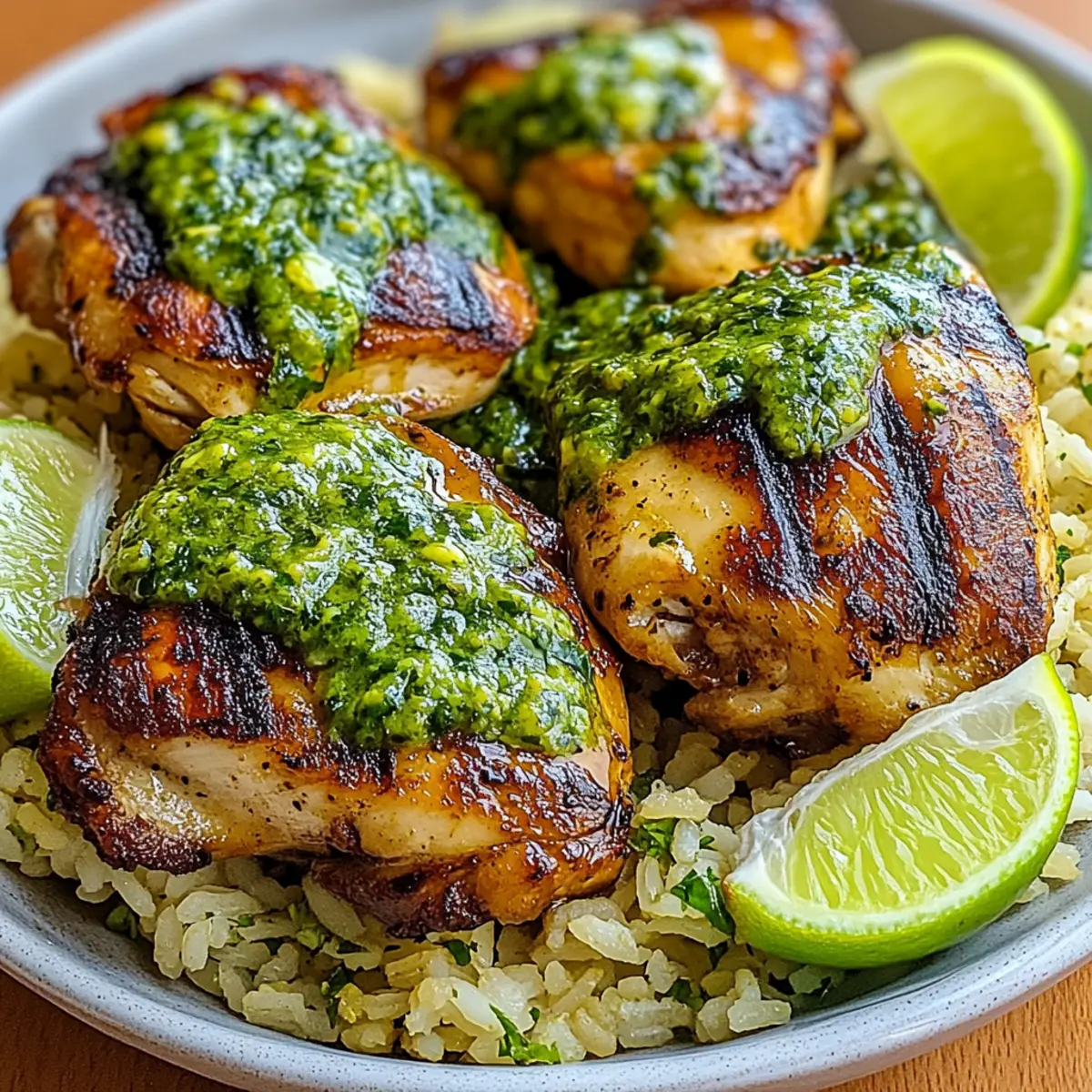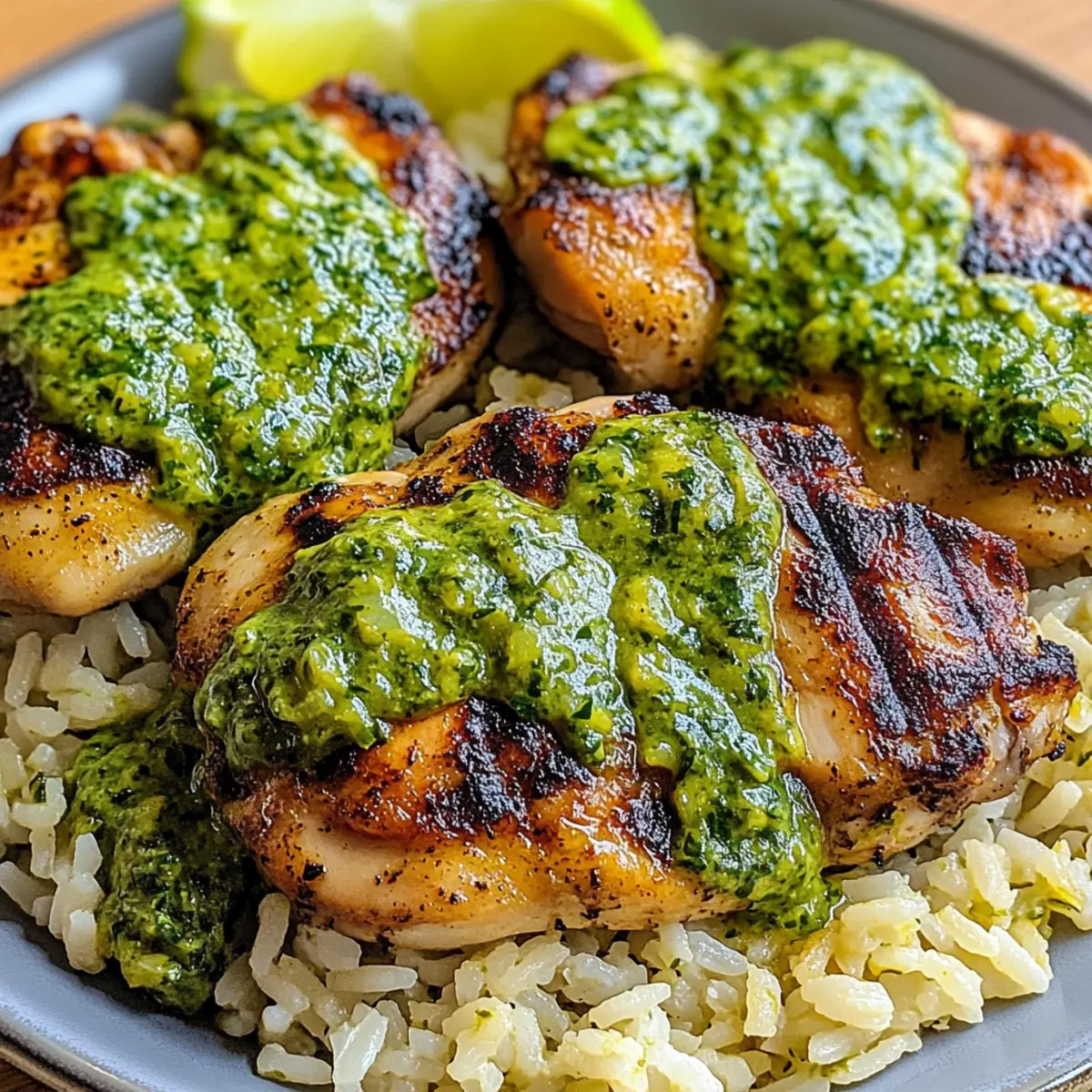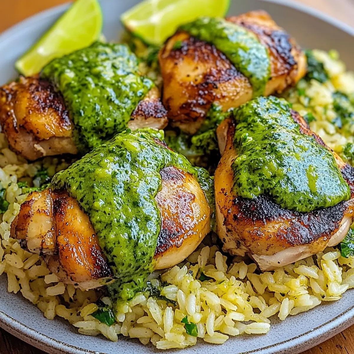 - Serve a scoop of fluffy jasmine rice on each plate, top with sliced chicken thighs, and drizzle with the green sauce. Garnish with chopped cilantro and lime wedges.