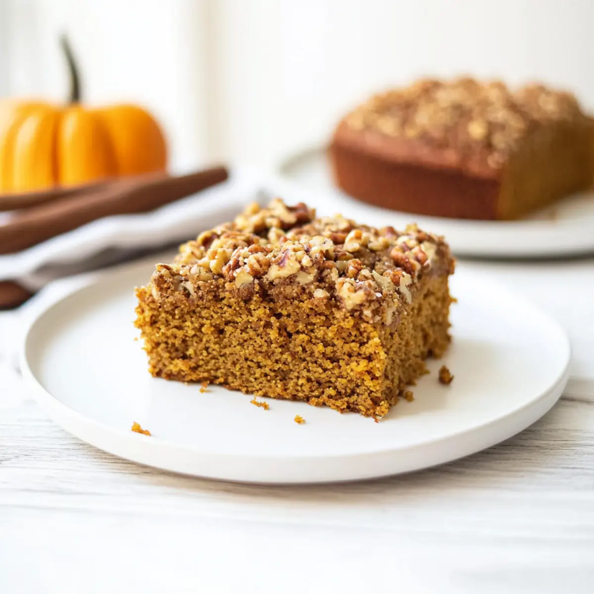 Once baked, remove the Pumpkin Coffee Cake from the oven and allow it to cool in the pan on a wire rack for about 10 to 15 minutes. This cooling process will help it set nicely before slicing it into squares. Enjoy your delightful cake as a comforting afternoon snack or a special treat at brunch!