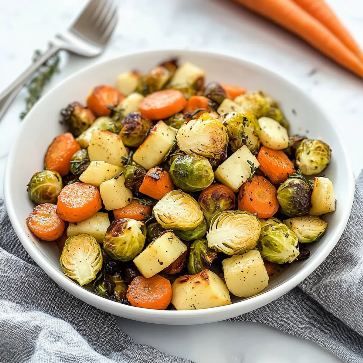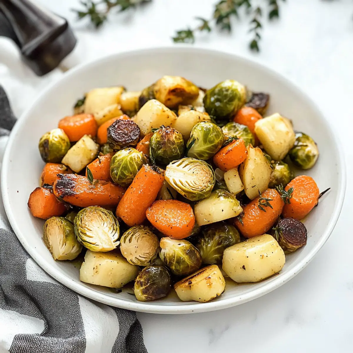 Roasted Brussels Sprouts, Carrots and Parsnips with Maple Thyme