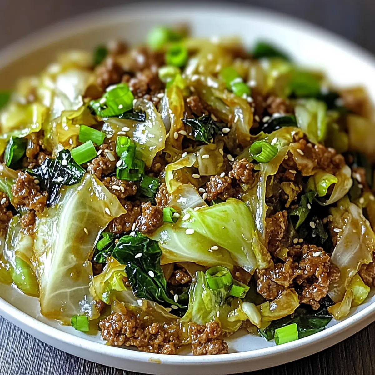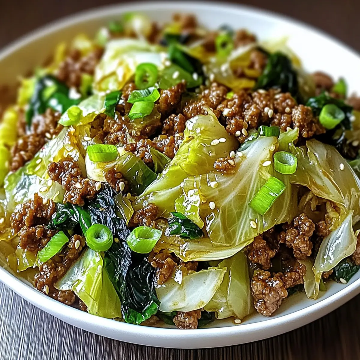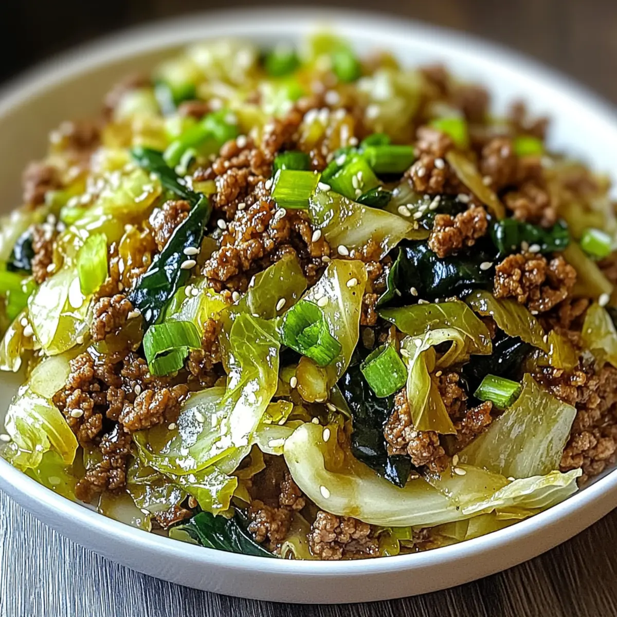 Remove the skillet from heat and garnish your dish with sliced green onions and optional sesame seeds for added texture. Serve the Savory Chinese Ground Beef and Cabbage Stir-Fry immediately over freshly steamed rice, enjoying the vibrant colors and enticing aromas that fill your kitchen!