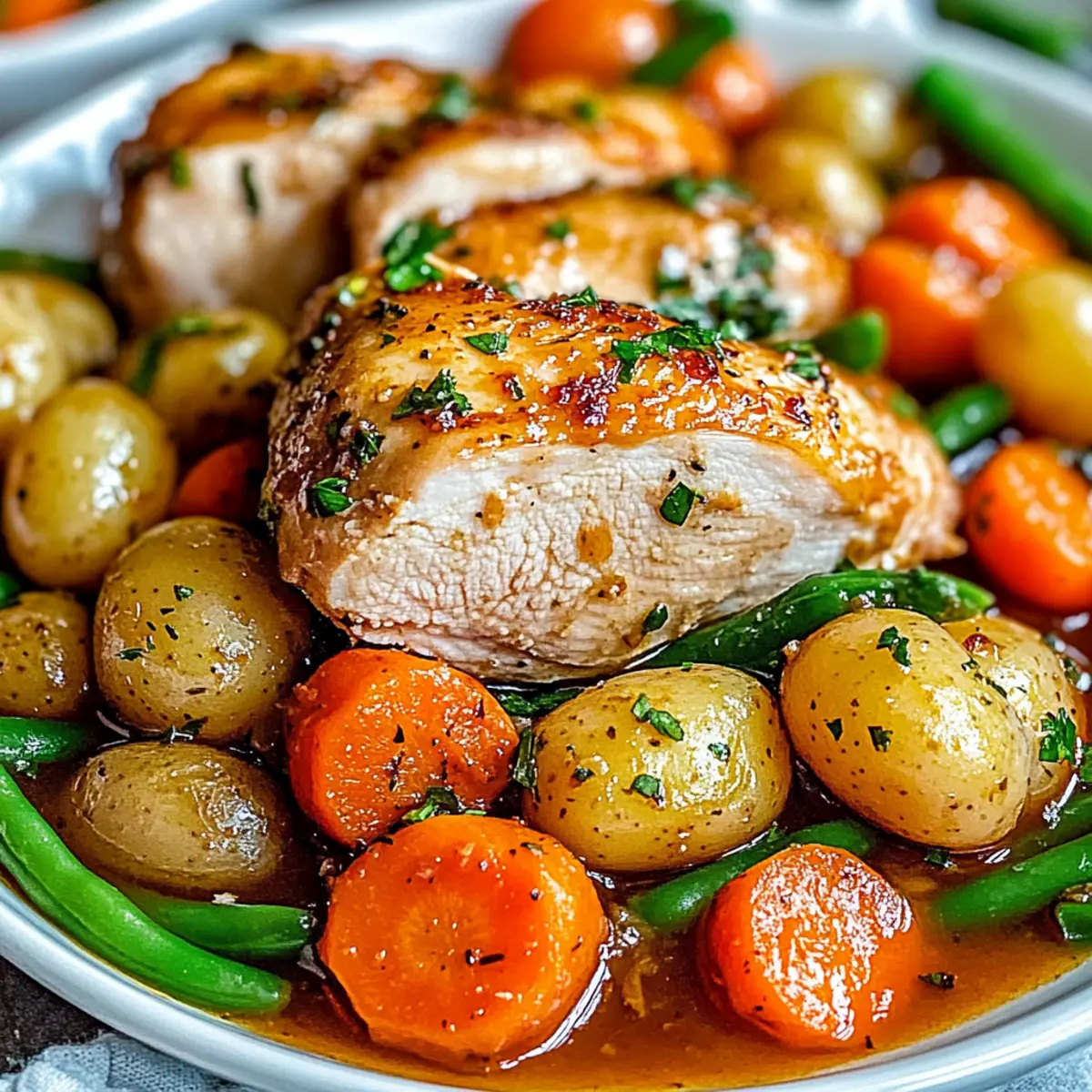 Start by placing the boneless, skinless chicken breasts at the bottom of your Crockpot. Next, evenly layer the halved baby potatoes, sliced carrots, trimmed green beans, and round onion pieces on top. This arrangement helps achieve even cooking, with vibrant vegetables and tender chicken mingling beautifully.